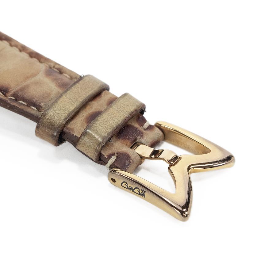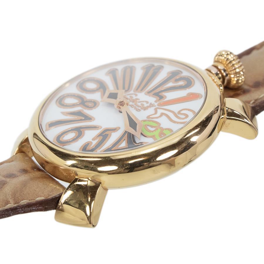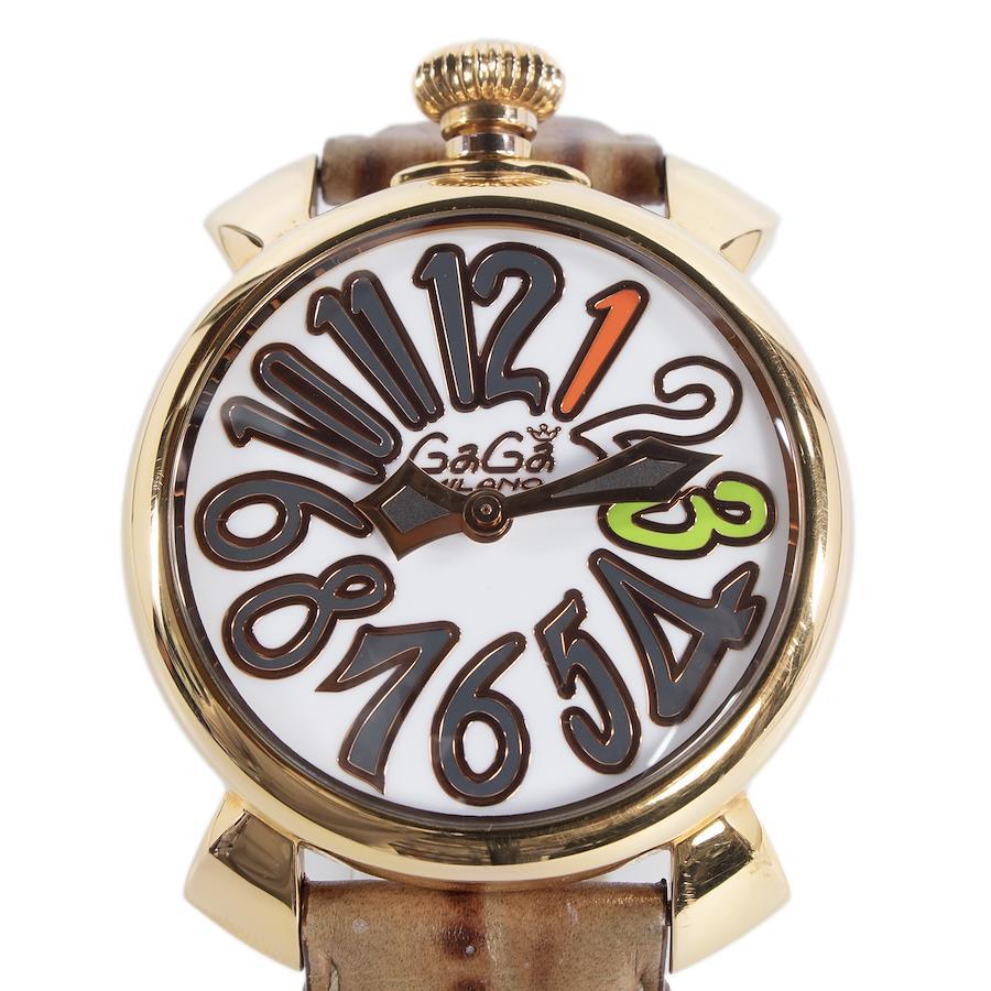 ピンクゴールドの華やかなケースに、個性的なアラビア数字を配した、ガガミラノならではのデザインが光ります。