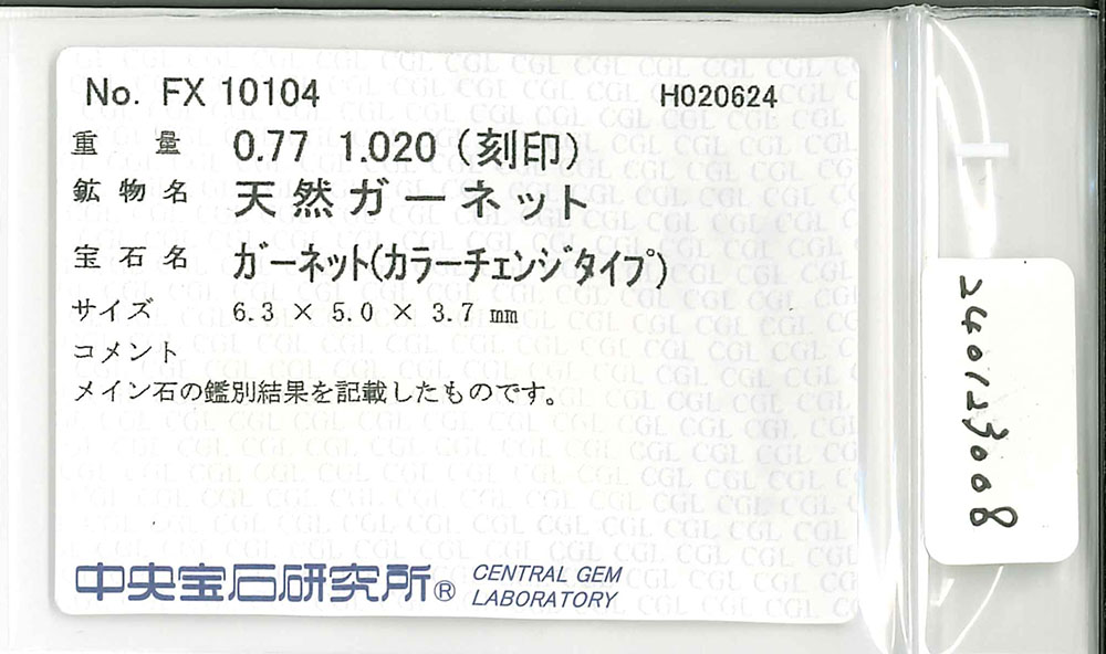 石目:0.77/1.020刻印(チェンジカラーガーネット1石0.77ct×ダイヤモンド計1.020ct)