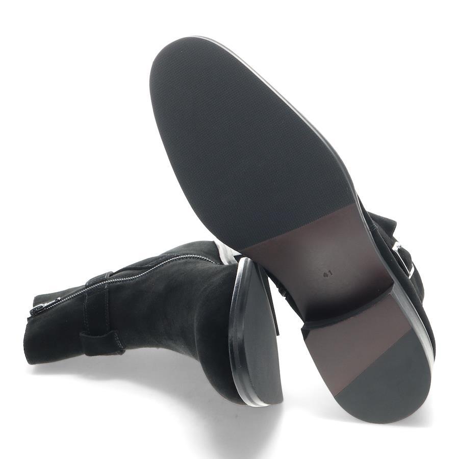 | シャフトを絞り上げた美麗シルエットのジョッパーブーツ 【素材】 毛並みをそろえグラデーションを加えたカウスエード。 ※天然皮革を使用している為多少のキズ、ムラ感が御座います。素材の特性上ご容赦ください。 【デザイン】 乗馬用に作られたジョッパーブーツを自社定番の木型で再構築。 シャフトを細く搾り上げ足首のホールド感を高めながら、幅広いパンツスタイルに取り入れやすいデザインに。 シルエットはセミラウンドトゥなので尖った印象になりにくく、きれい目にもカジュアルにも柔軟に対応しやすいマルチプレイヤー。 【サイズ感】 革靴で25.5cm、スニーカーで26.5-27cmを着用するスタッフで<41/25.5cm>でジャストサイズでした。 ※サイズ感は、個人差がございますのであくまで参考程度にお考え下さい。 ■ブランド:whoop'-de-doo' costume no age ■カラー:ブラックスエード、キャメルスエード ■アッパー素材: カウスエード(牛) ■裏地:豚革 ■底材:ラバー ■ソール:約1cm ■ヒール:約3.7cm ■重さ(片足):約564g ■製法:セメント製法 ■中国製 *上記は全て25.5cmで計測した数値です。 *多少の誤差が生じる場合がございますので予めご了承下さい。 whoop de doo co.,ltd whoop'-de-doo' フープディドゥ |