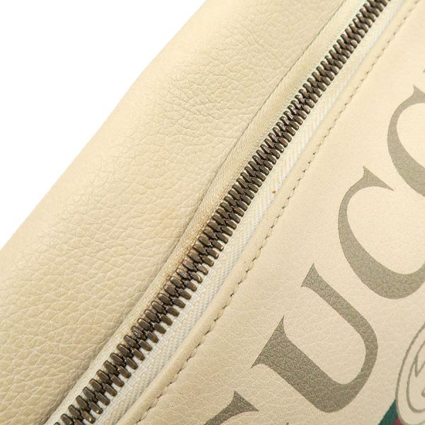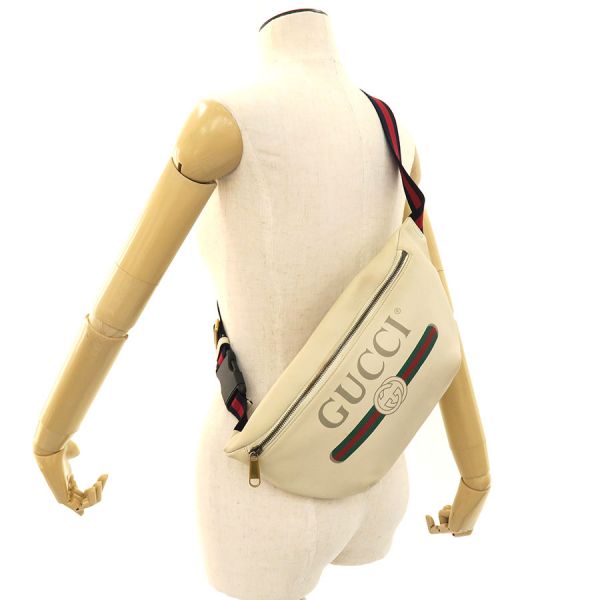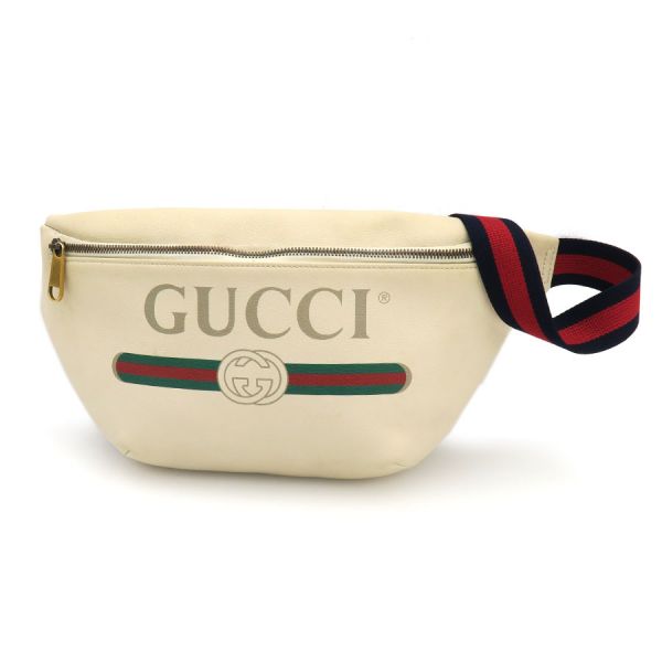 "グッチ ロゴプリント・ボディバッグのご紹介です。2018年クルーズコレクションのGUCCIプリント、レザーベルトバッグで、アイボリーカラーのレザーベースに薄いグレーカラーのGUCCIロゴ、GG、緑×赤×緑のウェブラインが前面の大きくプリントされております。間口はファスナー開閉、内部はオフホワイトのキャンバス仕様、ポケットは無く、ざっくり収納するタイプになります。ベルトも緑×赤×緑のウェブラインです。状態はBランク。外観には多少の型崩れ、ヤケや汚れ、内部に薄汚れ、大きく目立つものはあまり無くグッチ ロゴプリント・ボディバッグはいかがでしょうか☆"