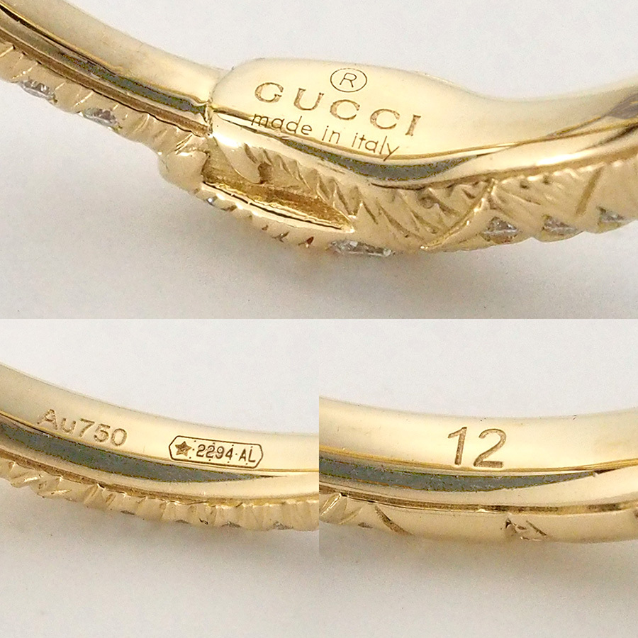 Brand: GucciProduct Name: Ouroboros Diamond RingModel Number: --Size: Approx. 12Maximum Width: 3.3mmBack Arm Diameter: 2.5mmWeight: 3.4gMaterial: 18K Yellow GoldStamp: Au750 (R) GUCCI Made in Italy 12Suggested Retail Price: --Accessories: Case, Dust BagRank: SACondition/Notes: PolishedIf you have any questions about this item, please contact us via the Q&A form.If the stone size is not listed, it is considered an unknown size due to the lack of engraving.