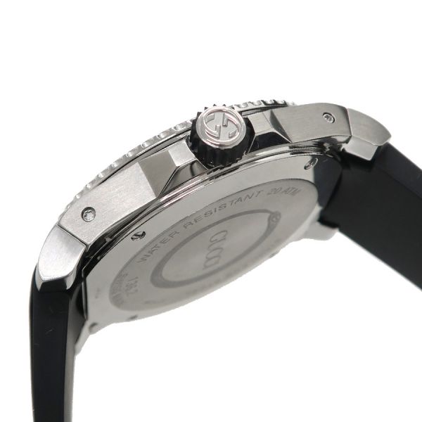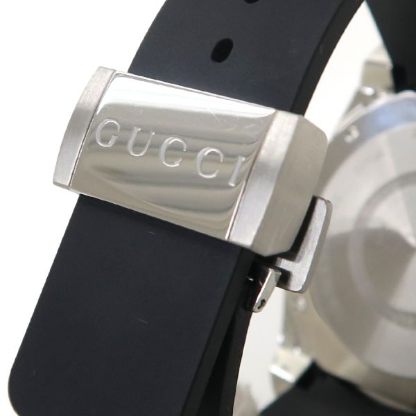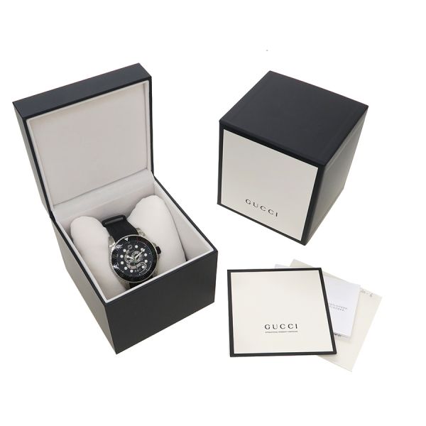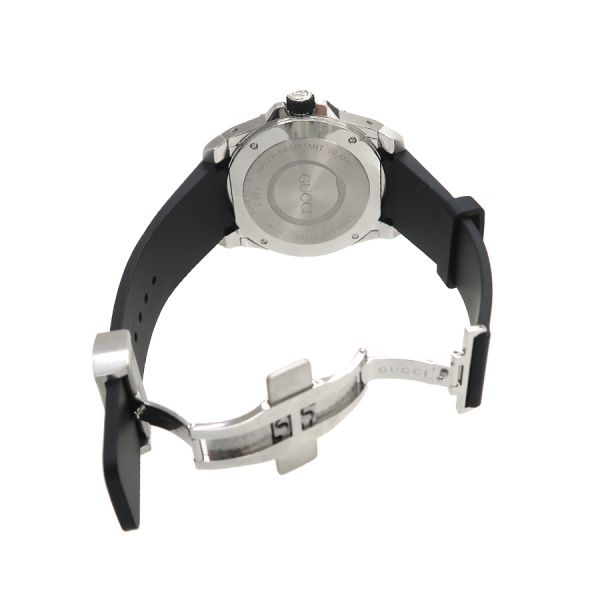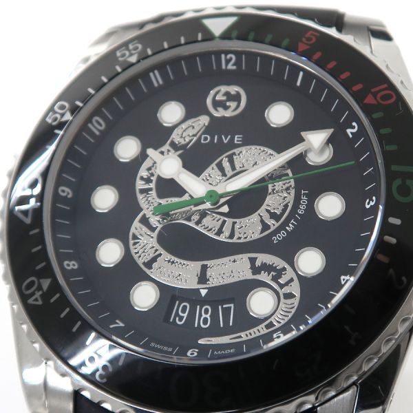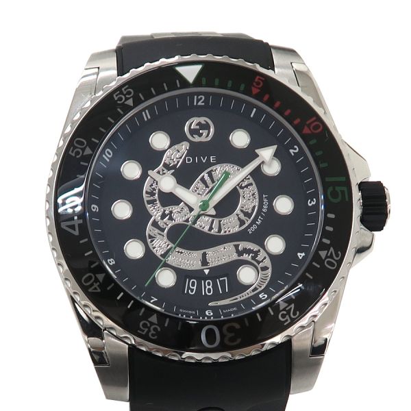 グッチ のダイバーズウォッチ、ダイブのスネークモチーフが文字盤のモデルのご紹介です。丸型、文字盤の12時位置にGG、6時位置に日付け、3針(秒針は緑色)、インデックスと針に夜光付き、回転ベゼル、ラバーベルト、両開きのバックルタイプになります。状態はAランク。使用感も少なく、大きなダメージ無く、早いもの勝ちですね☆