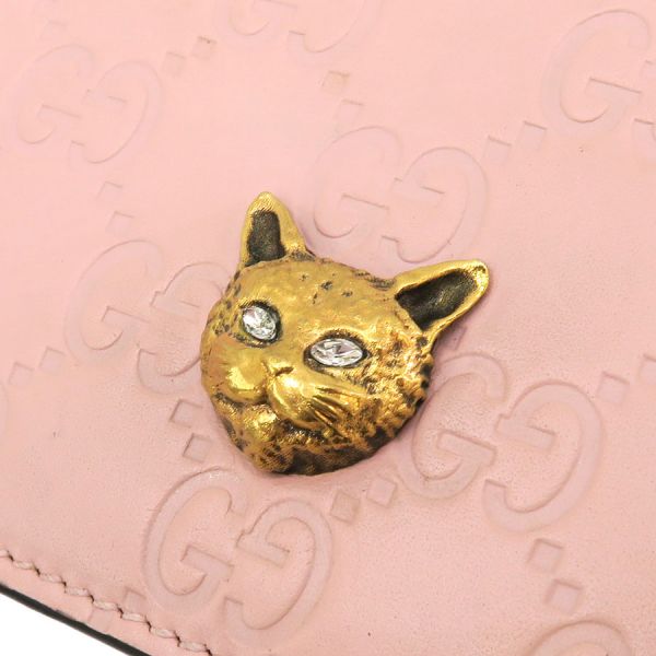 グッチ シマ・チェーンウォレットのご紹介です。ピンクのグッチシマにリネアキャットが目立つモデル。ホック止めを開くと、裏にはミラーが埋め込まれてております。内側にはファスナー付き小銭入れ、カードポケット?6、ポケット?2があります。GPのチェーンは取り外しでき、クラッチバッグとしてもお使いいただけます。状態はBランク。型崩れ、縁周りにスレ、ミラーに汚れ、カードポケットにヨレなどが感じられます。使用には問題なく、グッチ シマ・チェーンウォレットは如何でしょうか☆