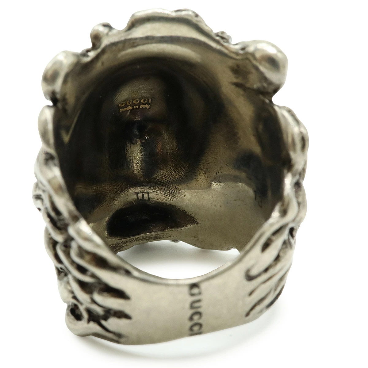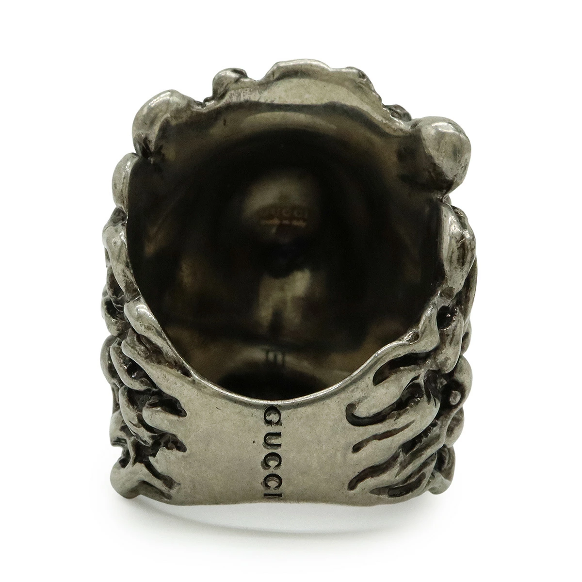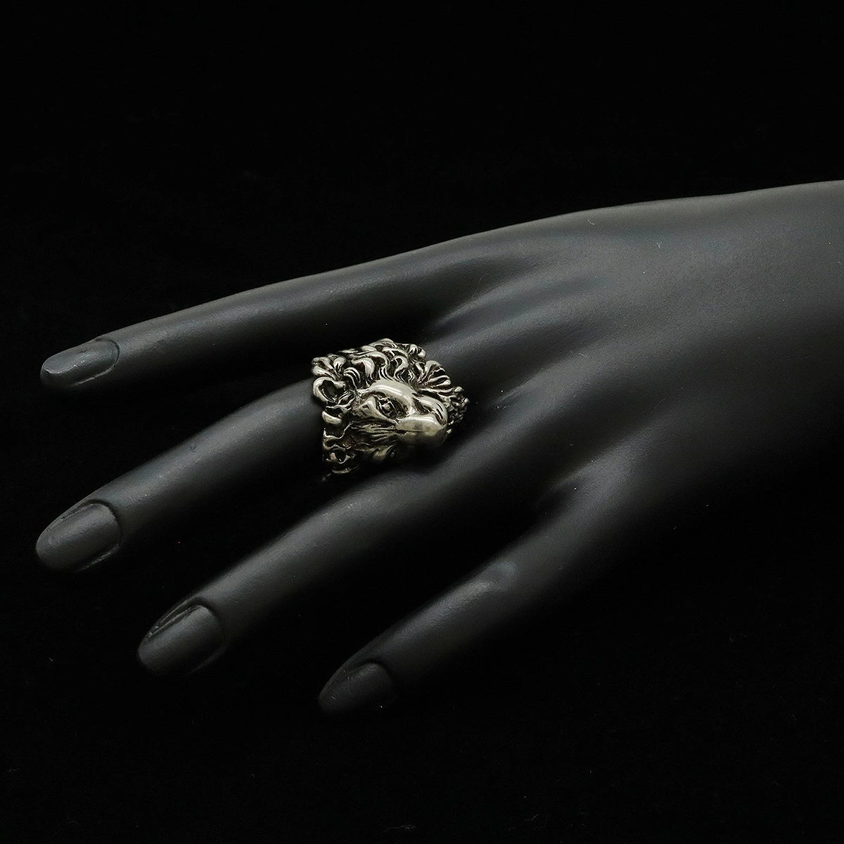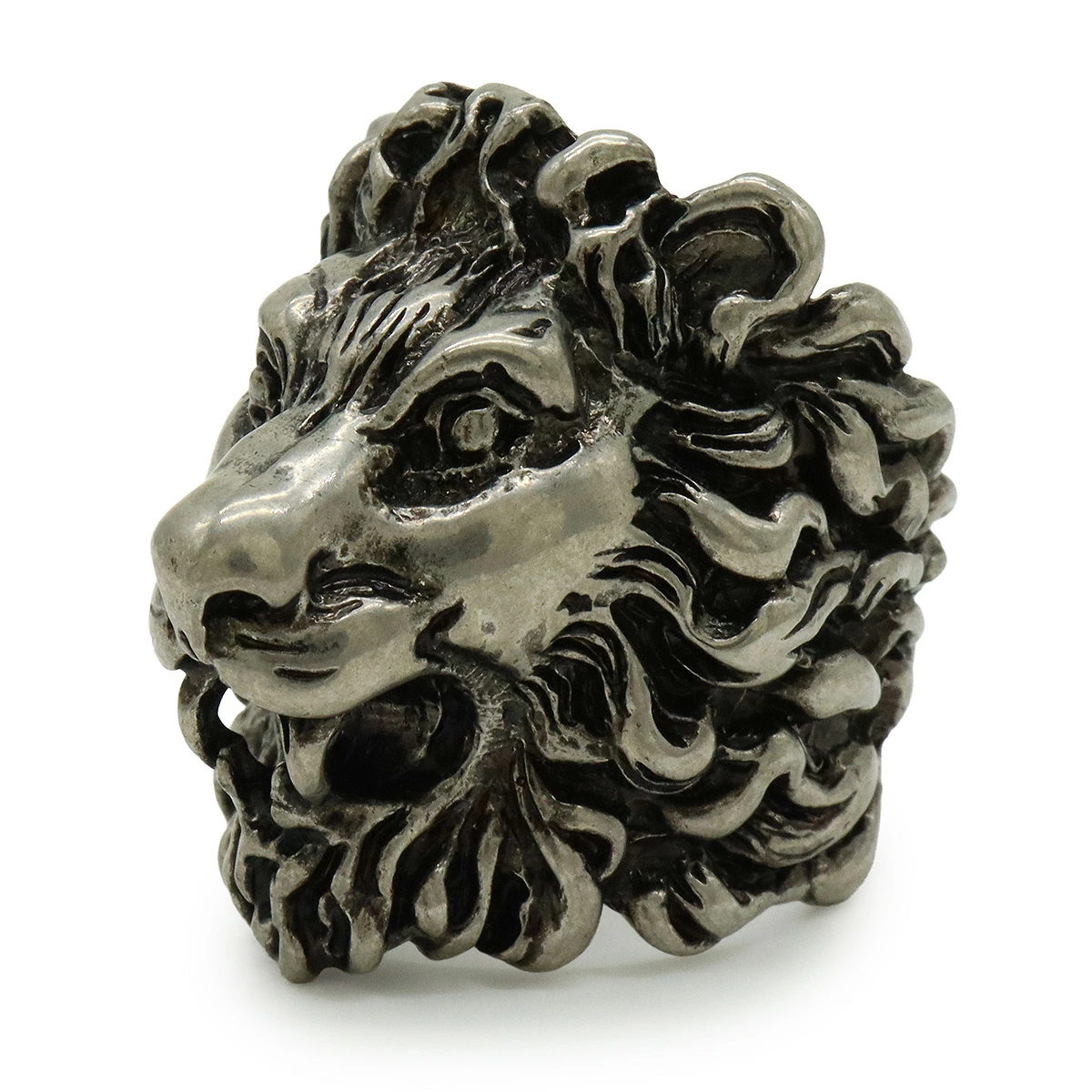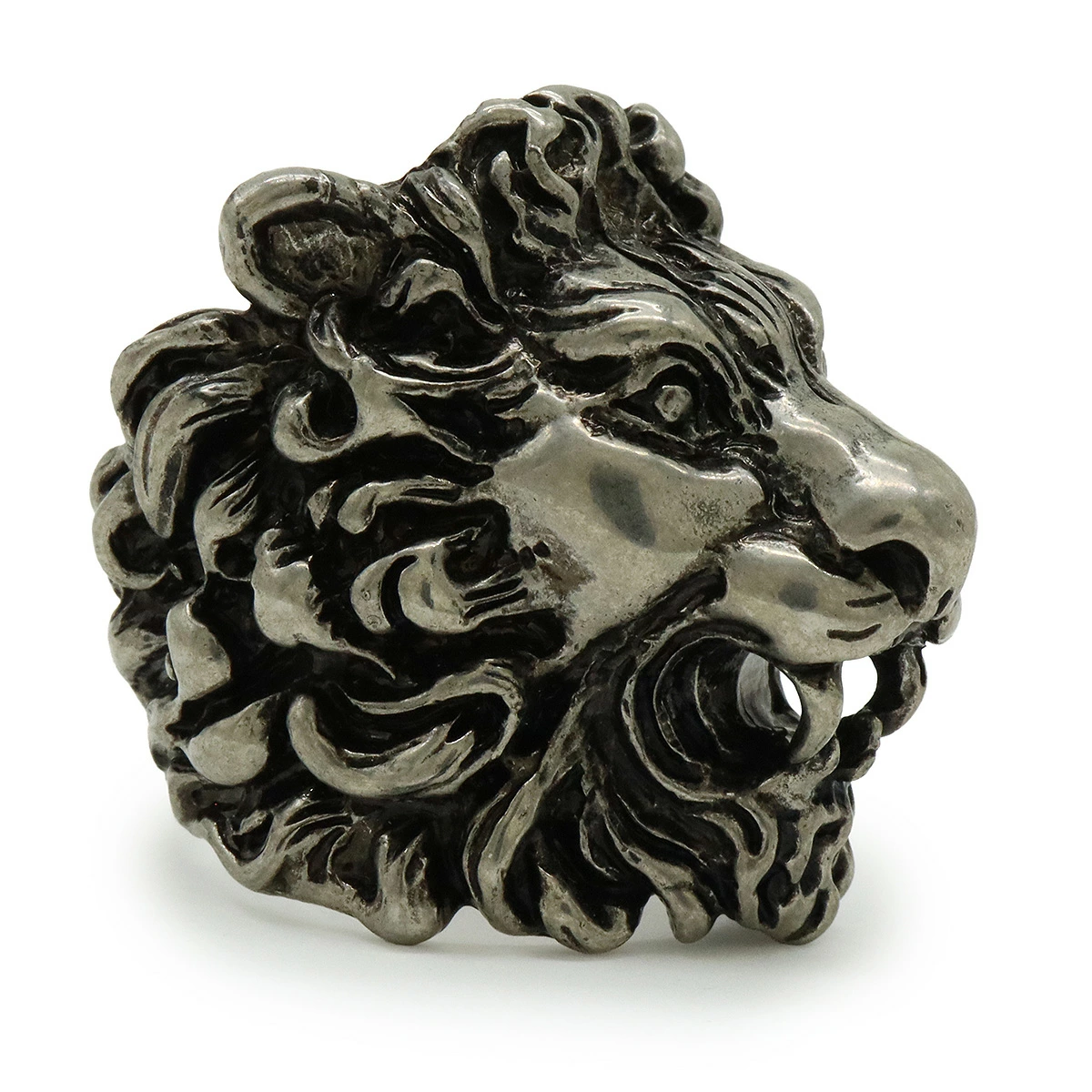 アンティークな風合いを持つこのリングは、ライオンモチーフが特徴で、見る人に強い印象を与えます。