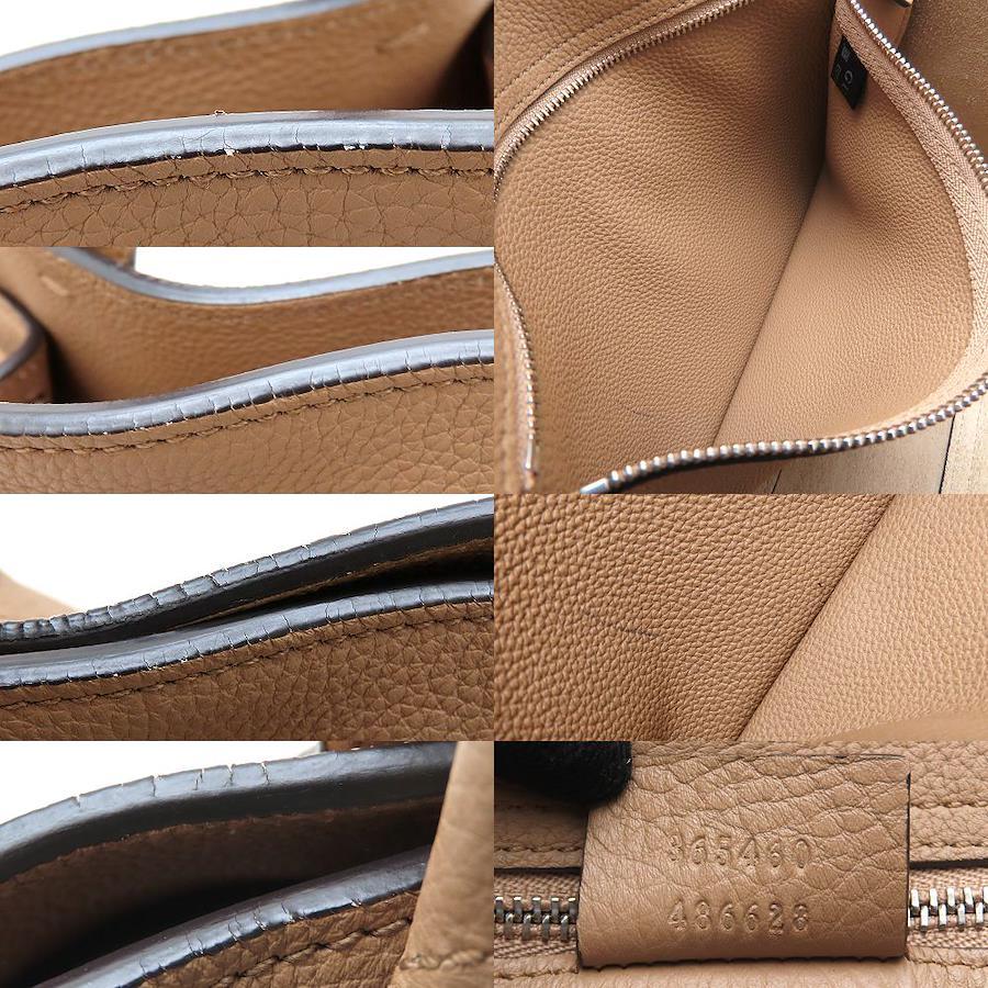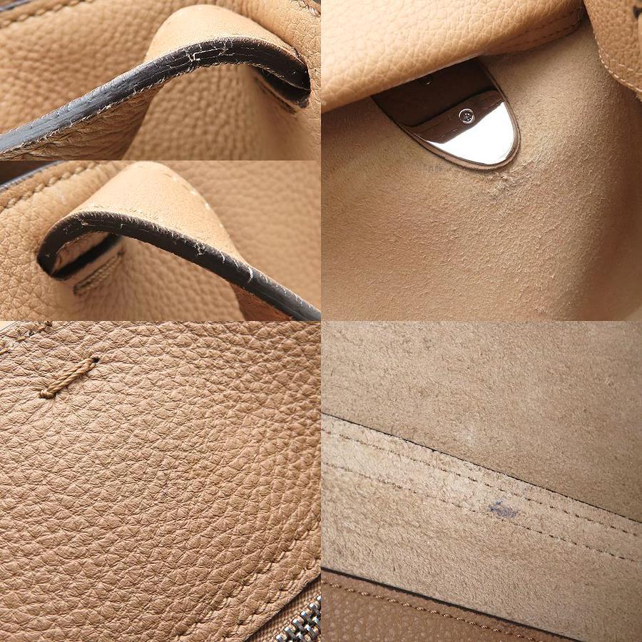 [外・表面] 一部汚れ / 接着跡 (糊跡) [外・ハンドル] キズ / 汚れ / コバにヒビ割れ [外スト・ショルダー] スレ [外・形状] やや型崩れ [外・角] スレ [外・縁] スレ / 剥がれ / コバにヒビ割れ / コバにスレ [ポケット] ペン跡 [金具部分] 小キズ [内側] スレ / 汚れ / 使用感あり / ポケット裏の金具まわりの生地に所々汚れ