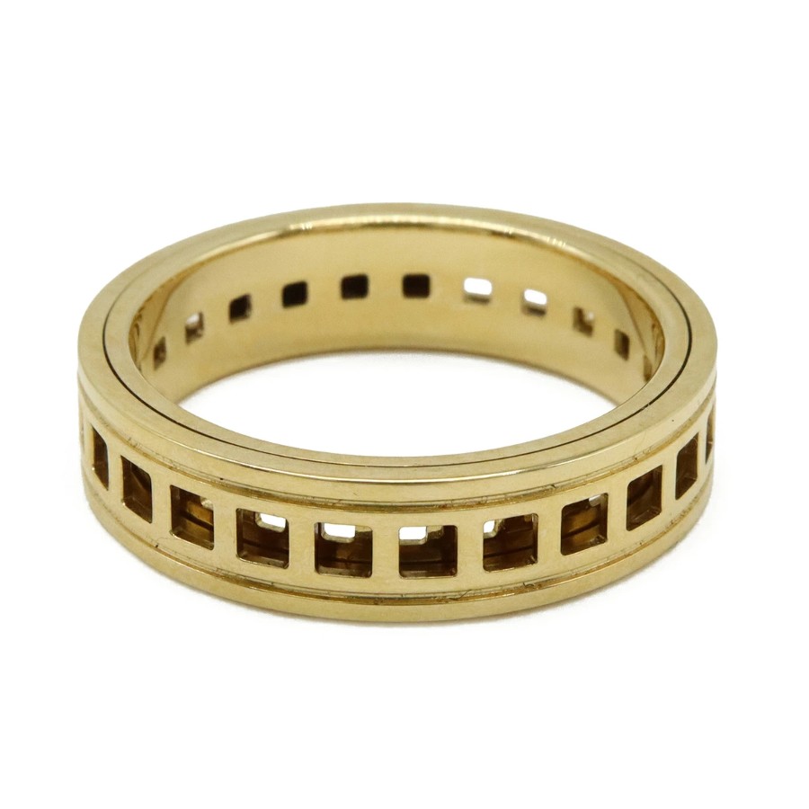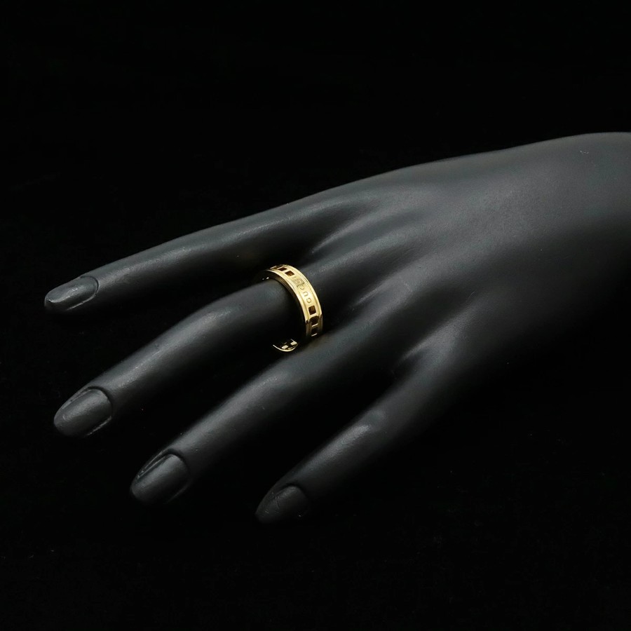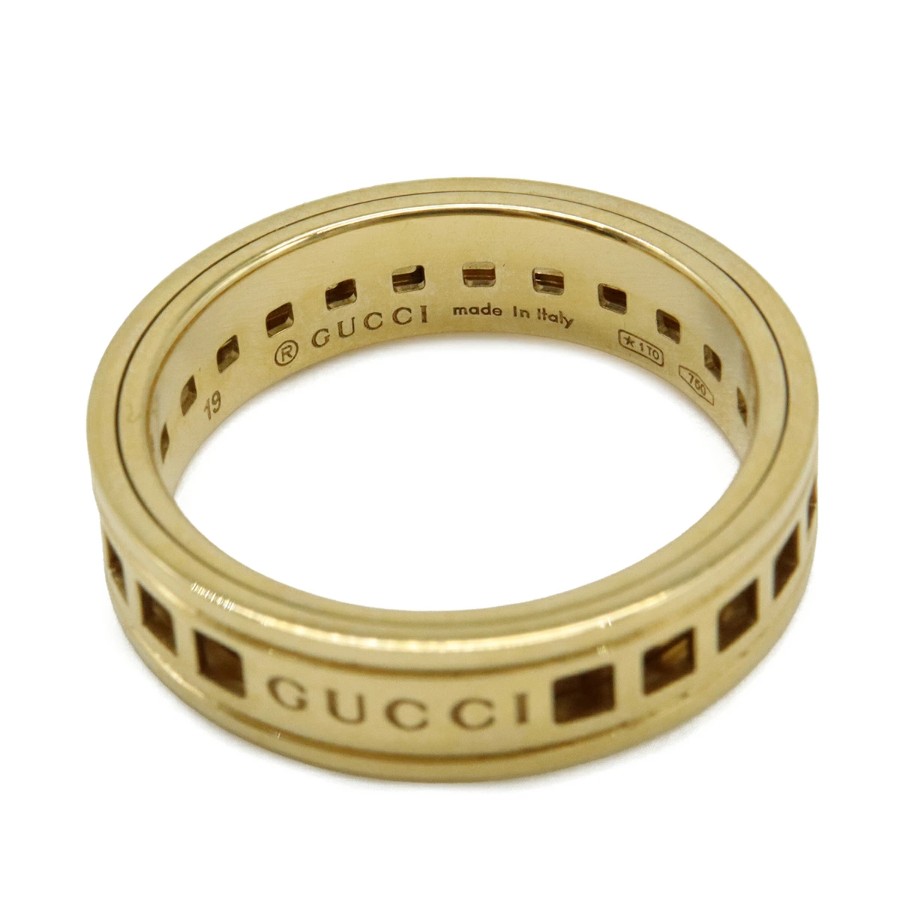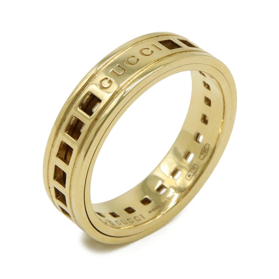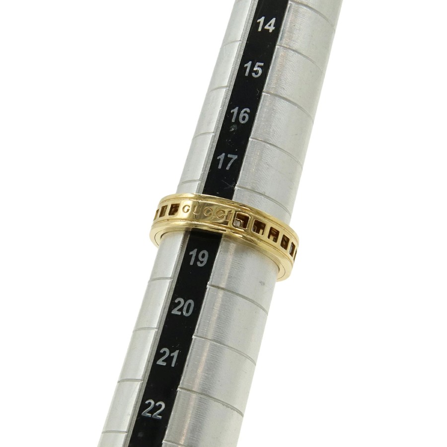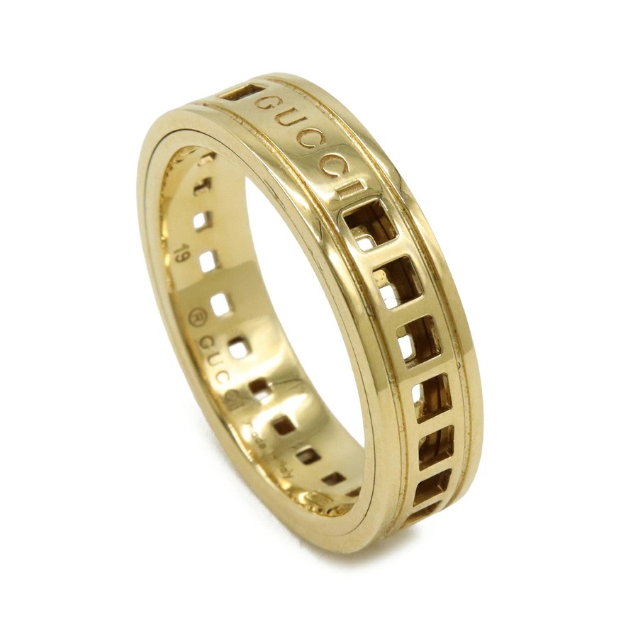 ブランドロゴが刻印されたメッシュ調のワイドなデザインが特徴の、エレガントで存在感のあるリングです。