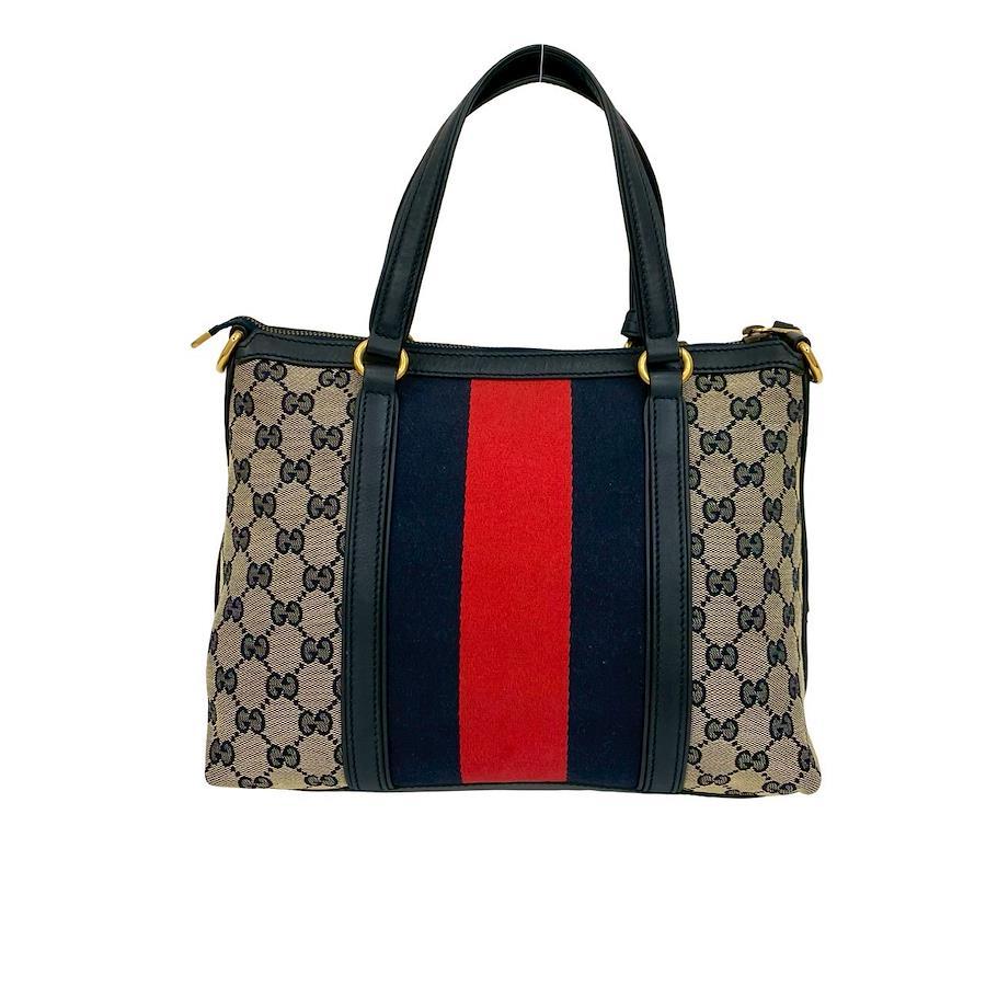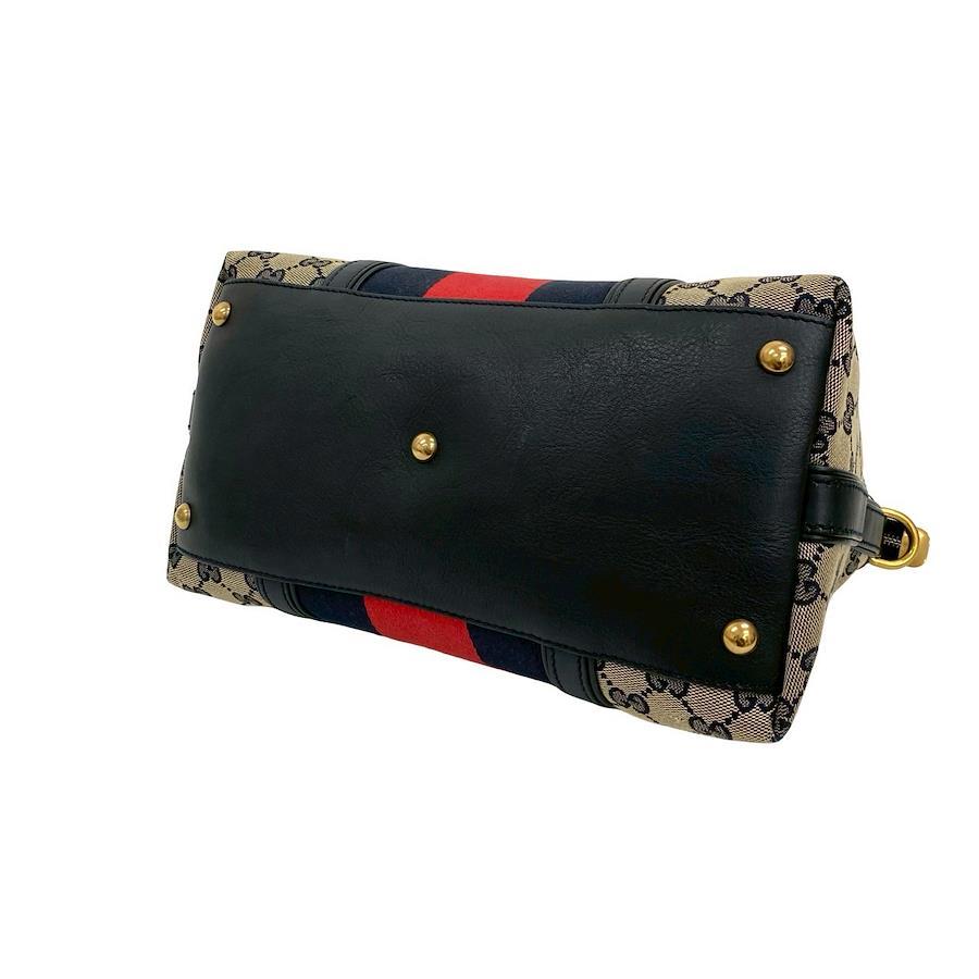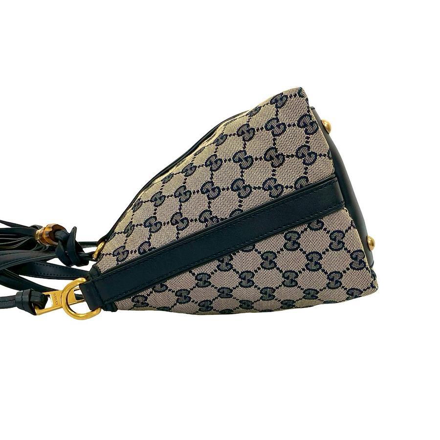 GUCCI Sherry Line GG Logo Canvas Leather Handbag with Tassel, Navy Blue, Mini Boston Bag, 03971
