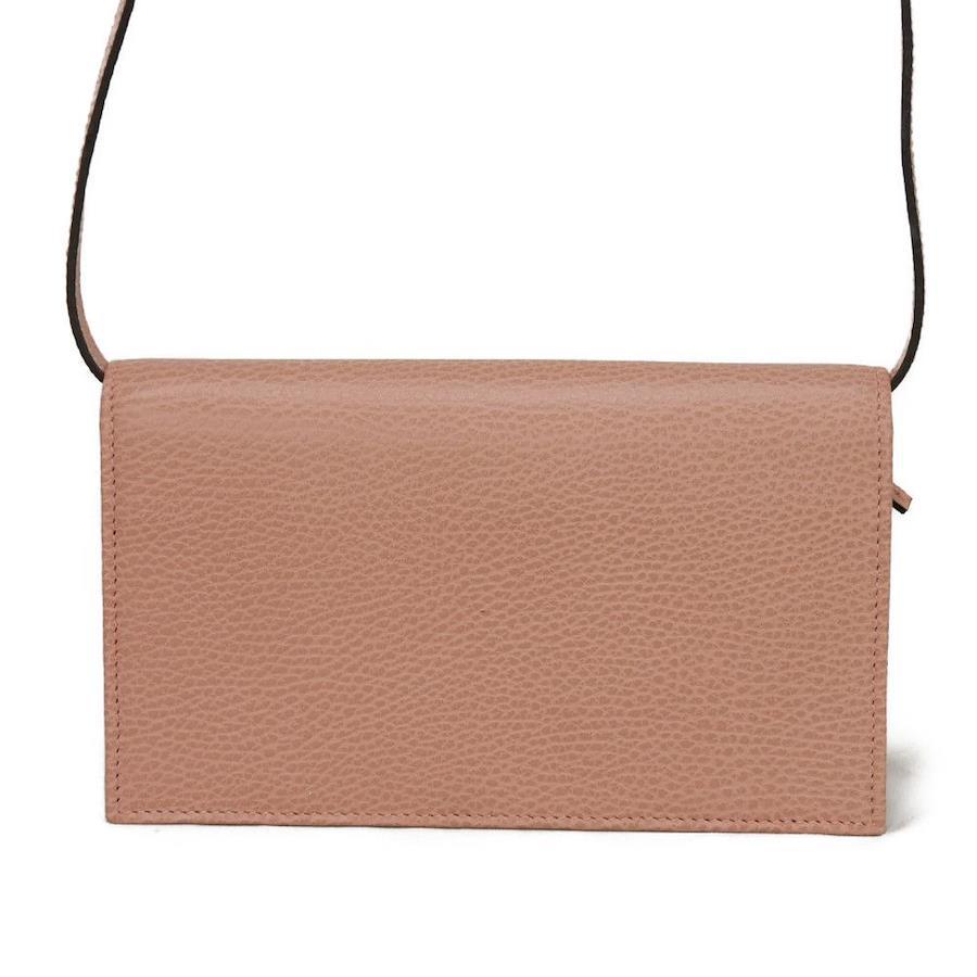 | 型押しが施された、カーフレザーに箔押しロゴがエンボス加工された「スウィング ショルダー ウォレット」長財布です。ショルダーストラップを外してミニクラッチバッグとしてもお使いいただけます。 |