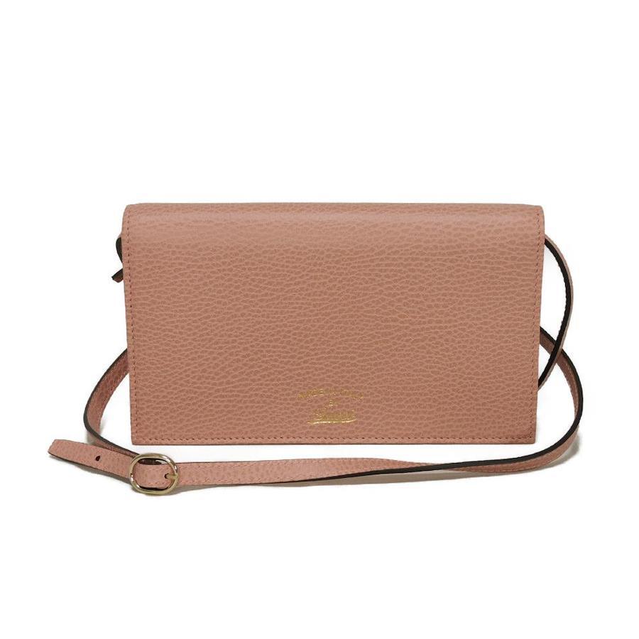 | 型押しが施された、カーフレザーに箔押しロゴがエンボス加工された「スウィング ショルダー ウォレット」長財布です。ショルダーストラップを外してミニクラッチバッグとしてもお使いいただけます。 |