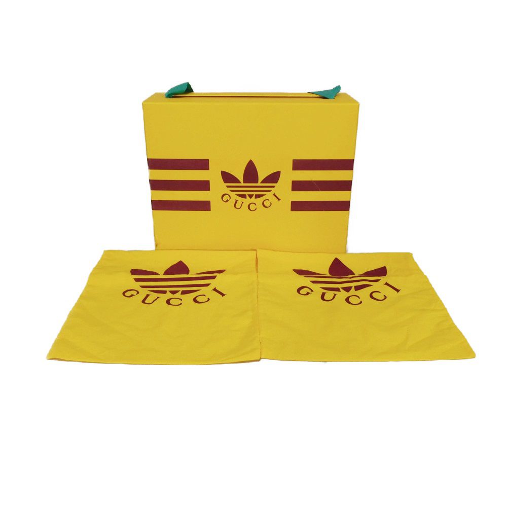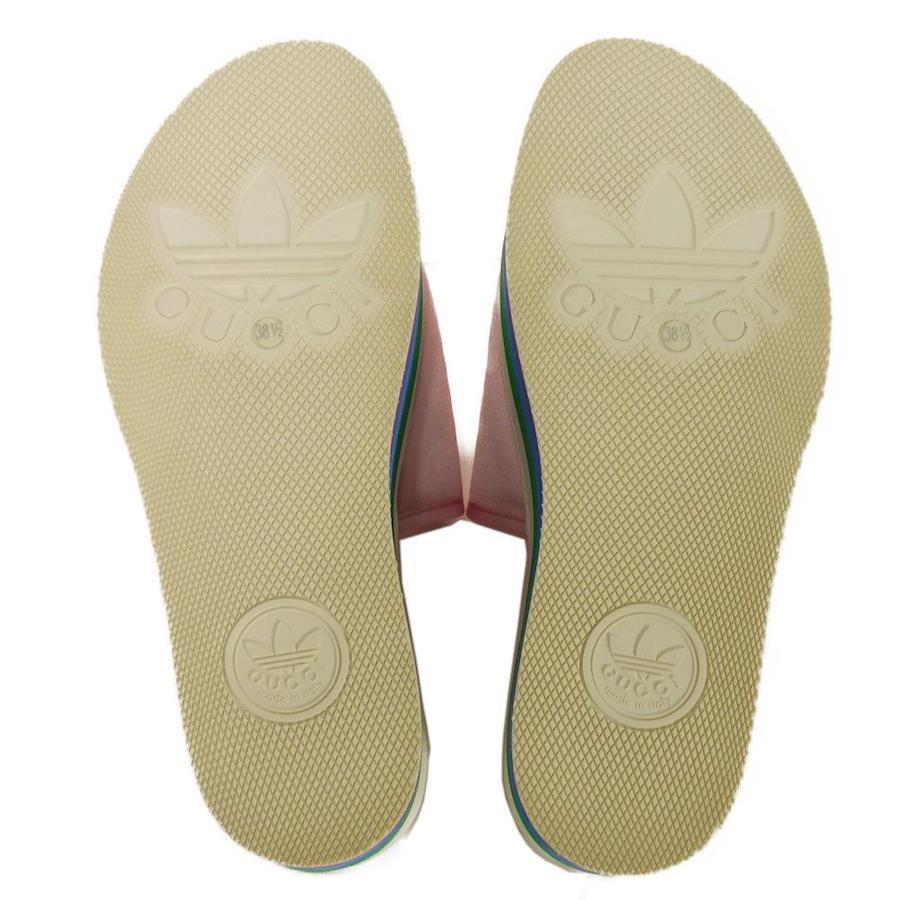 シルク素材にグッチのロゴとアディダスのモチーフがあしらわれた「トレフォイル プラットフォーム」厚底サンダルです。