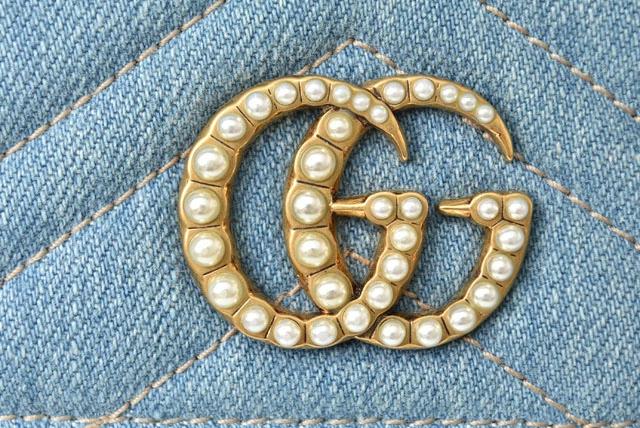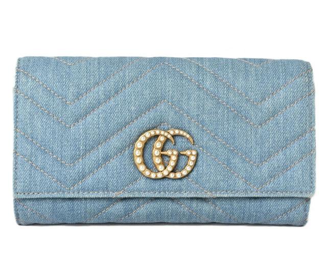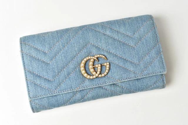 グッチより、高級感があり人気の高いマーモントのお財布です。センターには、フェイクパールの大き目のロゴ、背面には、キルティングステッチで"ダブルGロゴ"を表現。ポケットがたくさんあり、中身の整頓がしやすいです。