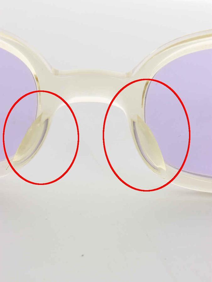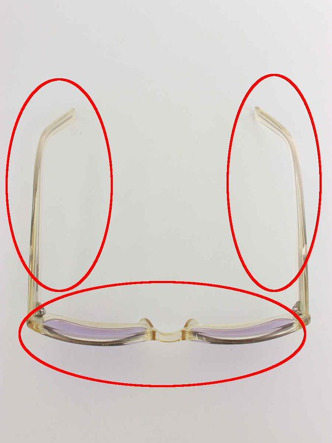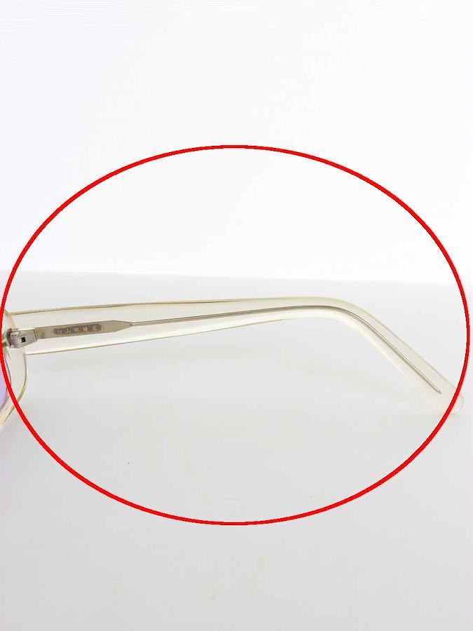 【汚れ・シミ】テンプル部分に付着物、青錆、くすみがございます。【傷・ツレ】テンプル部分、ノーズパット、フレーム部分に小キズがございます。【毛玉・毛羽立ち】特に目立つものはございません。【使用感】あり【こんな方におススメ】少しくらいのシミやダメージが目についても気にならない方にオススメ特に目立つものはございません。