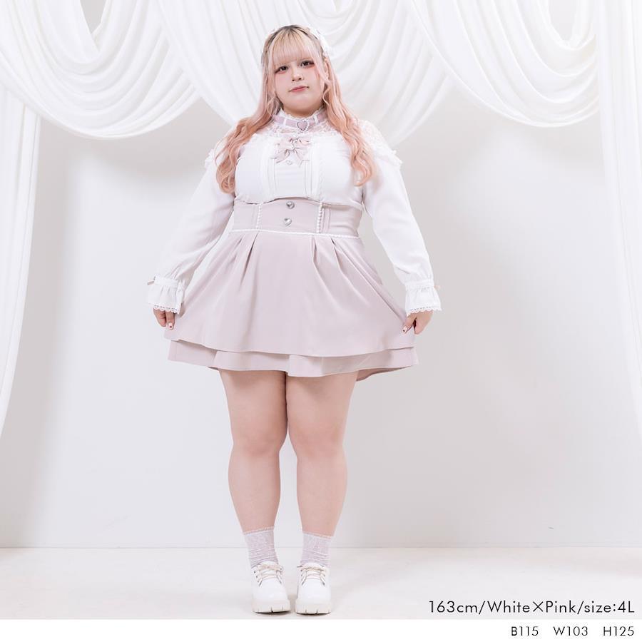 ハートたっぷりのかわいすぎるレースオフショルデザイン風ブラウス【デザイン】かわいいハイネック部分にはチョーカーデザインがあり、ハートパールベルト付きです。肩はオフショルデザイン風でレースがあしらわれていて少し肌見えるのがかわいい♪身頃部分にはキラキラのハートビジューボタンとハートビジューリボン付きです。リボンは安全ピンで取り外し可能の仕様になっています。リボンは写真のように付けて頂くのがかなり映えてオススメ♪レースとフリルたっぷりのかわいいデザインブラウスです♪首後ろのスナップボタンを外して被りで着ていただく仕様です。首元のバックルを外さなくても着脱できるようになっています♪【素材】さらりとした肌触りで、少し張り感のある素材感です。ホワイトは濃色下着が透けることがありますので、インナーの着用をおすすめいたします。【コーディネート】カラーによって地雷系や甘め系コーデに合わせられるかわいいブラウスです。ブラウスのデザイン上、スカートにインして着用をオススメ致します。1枚で映えるポイントたっぷりなので自撮りにもおすすめです♪《透け感》カラーによってあり 《生地の厚さ》普通 《裏地》なし 《伸縮性》なし《生産国》中国