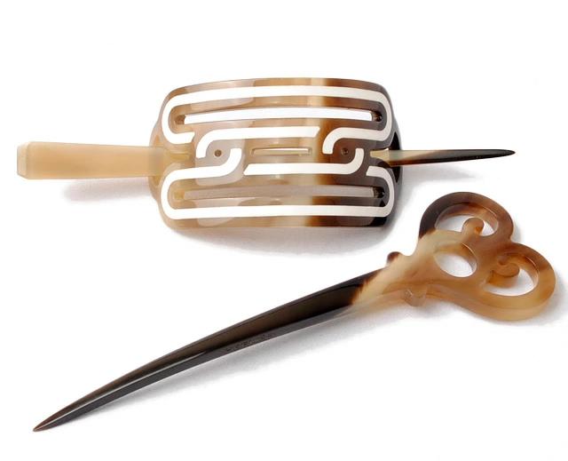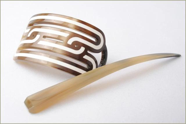 エルメスより、人気のかんざしです。水牛の角を加工して作られた髪飾りで、一本一本風合いが異なり、素材特有の風合いを楽しめる逸品です。和装にも、しっくりくるナチュラルカラーが、おしゃれ!着物、浴衣、普段使いにもファッションのアクセントにオススメです。