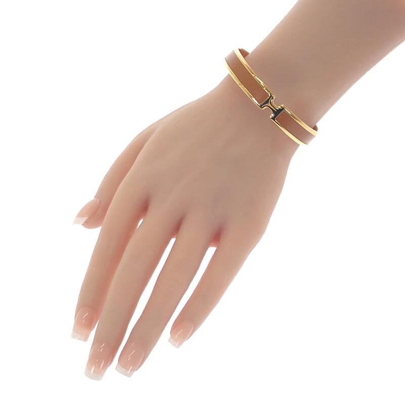 艶のある上質なボックスカーフレザーを使用し、しっとりとした質感と美しい曲線が手首に優しくなじむ、ラグジュアリーなレザーバングルです。カラーは深みのあるブラウン系「カネル」。クラシックで温かみのある色合いが、肌に溶け込むように自然にフィット。シンプルでありながらも、洗練されたフォルムとディテールのバランスが絶妙で、エルメスらしい上質な存在感を放ちます。