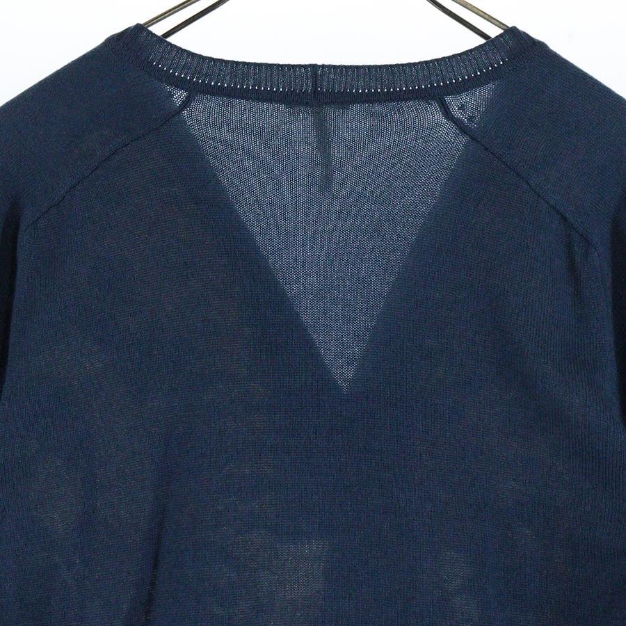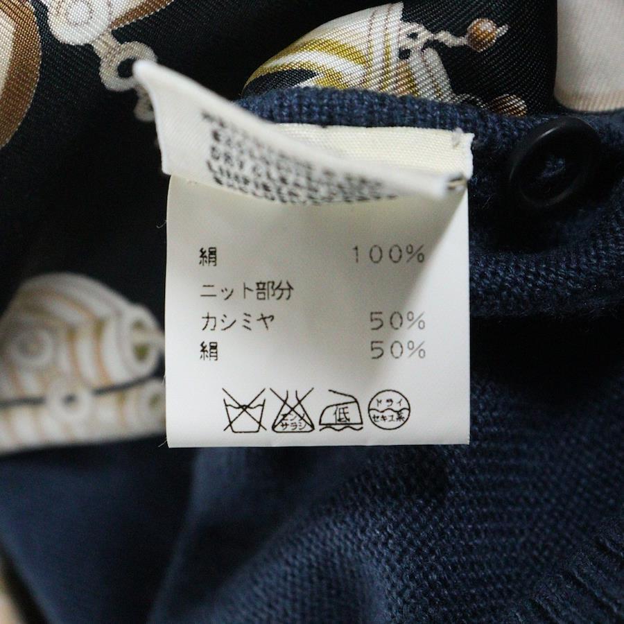[モデル]馬具 チェーン総柄プリント シルク カシミヤ混ニット切り替え カーディガン ネイビー レディース