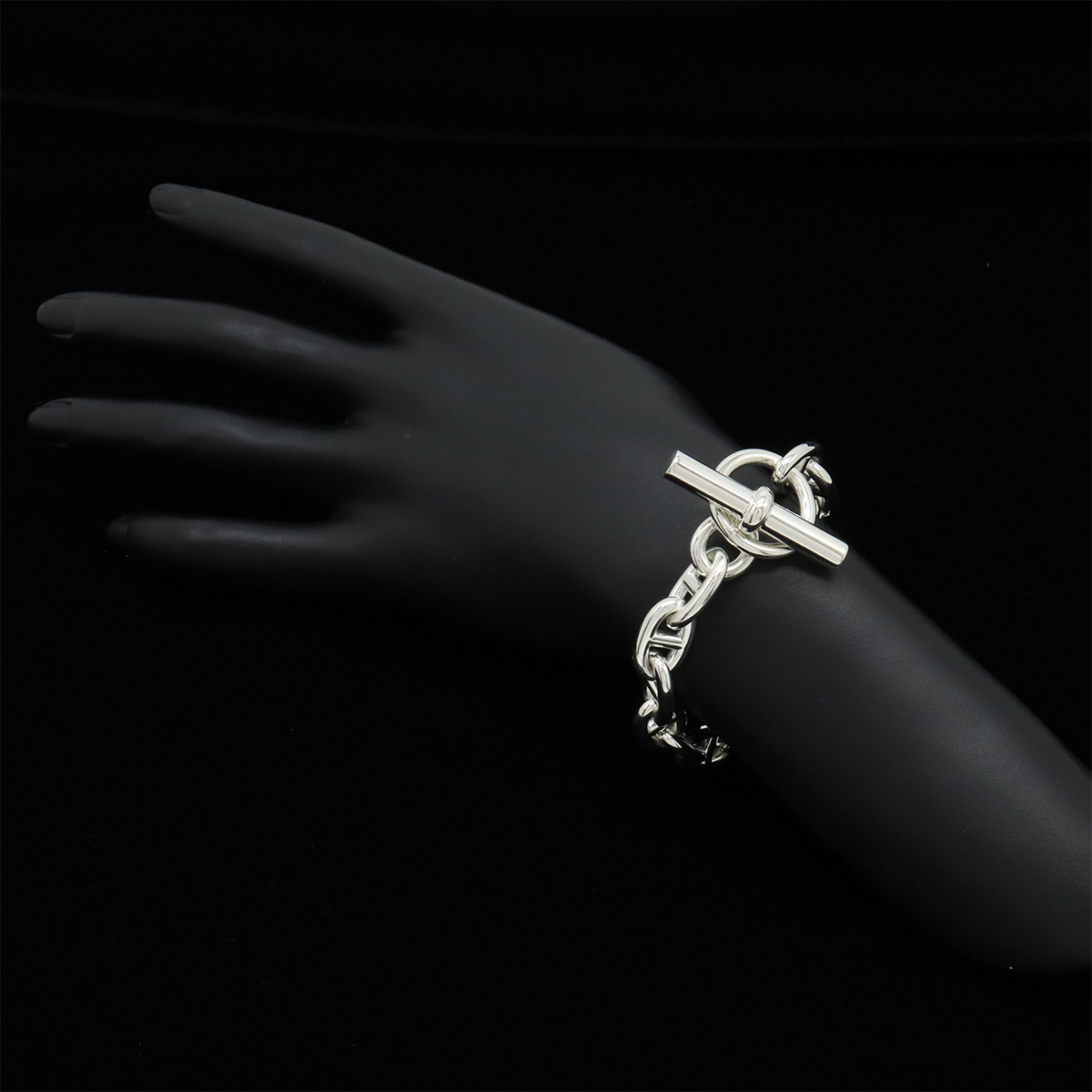 【コメント】弊社提携工房にて新品仕上げ済みですが、取り切れなかったスレ等がございます。エルメスを代表するシェーヌダンクルのシルバーブレスレット。程良いボリューム感で手元を優雅に演出してくれるアイテムです。