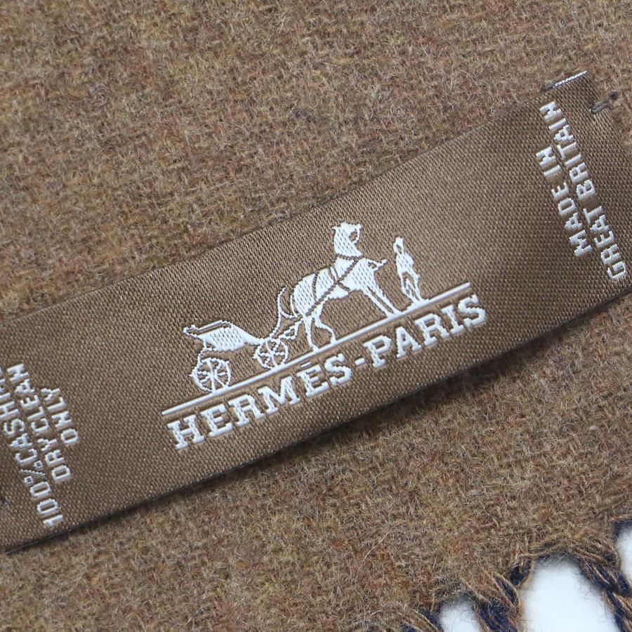HERMES Echarpe Kazac Chevron Cashmere Scarf / Two-tone Reversible Fringe Double-Face / Made in England / Brown and Navy / Fashion Accessory [Women's] [Pre-owned] [K4618]