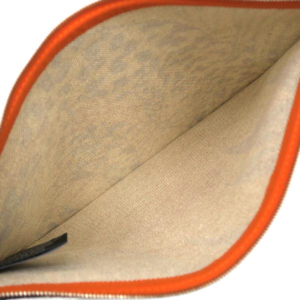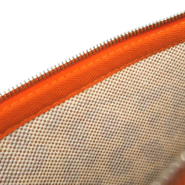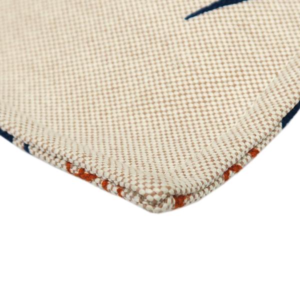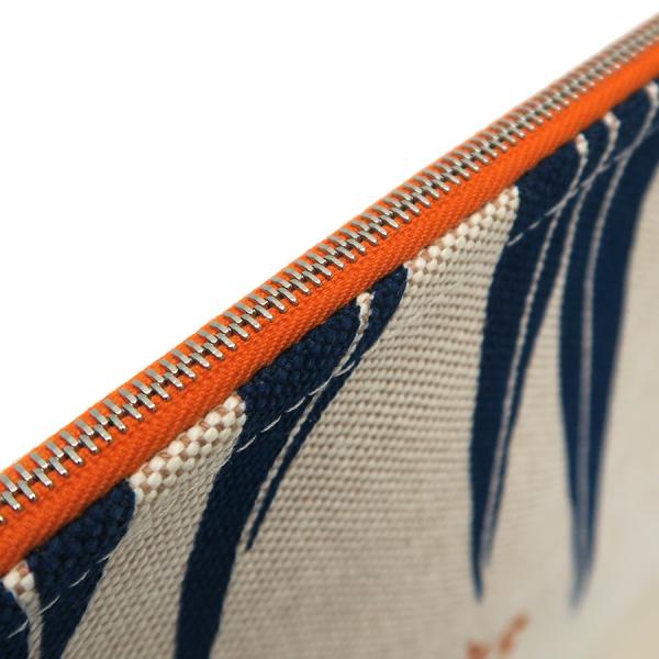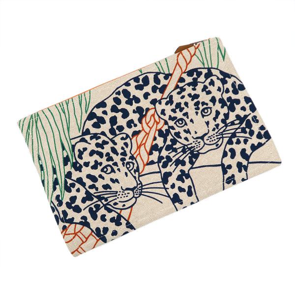 エルメス フラット・ポーチエルメス フラット・ポーチのご紹介です。オフホワイトより黄色が強めの色合いのコットンキャンバス素材のポーチで、表面に紺色の葉柄と赤のHERMESロゴ、背面に緑色の葉柄、赤色の縄?紺色の豹2頭の柄がプリントされております。間口はファスナー開閉、ファスナー周りはオレンジ、内部は表面と同色のキャンバス地で、ポケットは無く、そのままザックリ収納するポーチです。状態はAランク。使用感はあまり感じられず、保管臭がわずかに感じられます。お手軽にお使いいただけるエルメス フラット・ポーチはいかがでしょうか☆