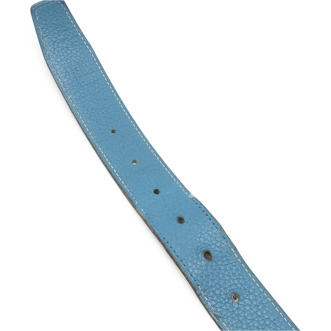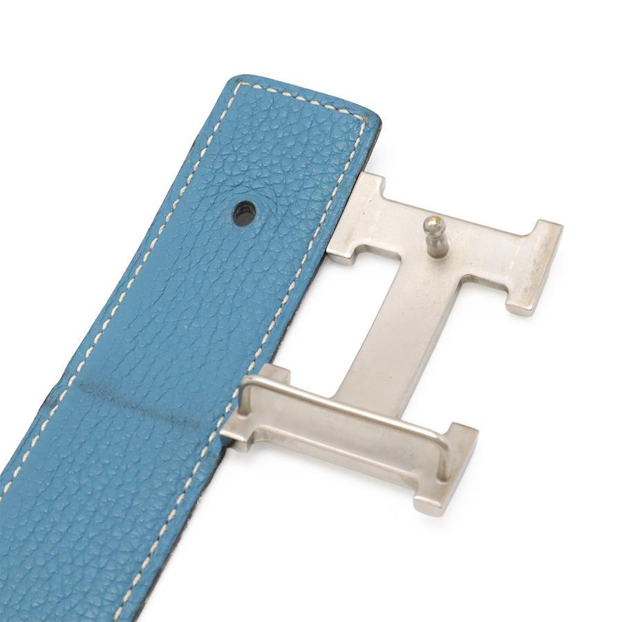 HERMES H-belt with H-buckle, reversible, Togo box calf leather, blue jean, light blue, black, silver hardware, #95, engraved with P.