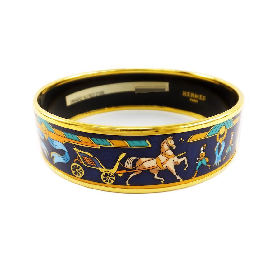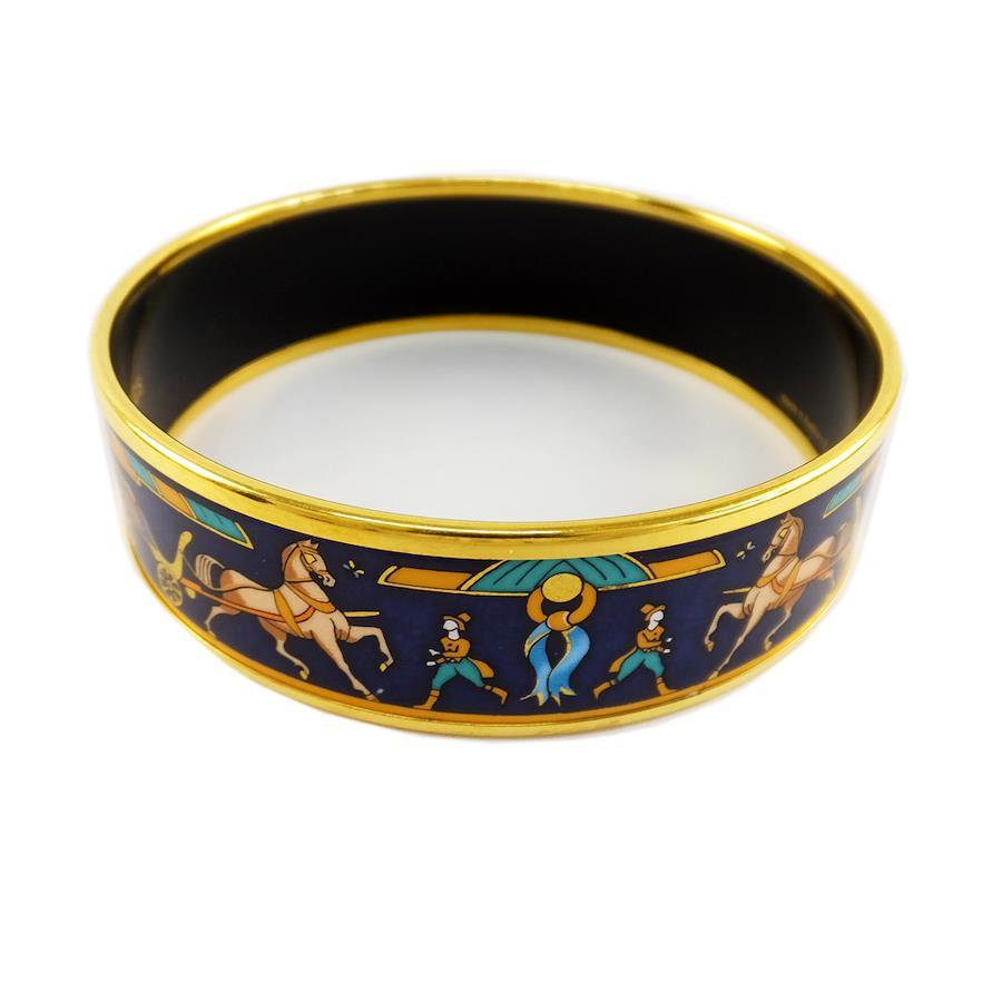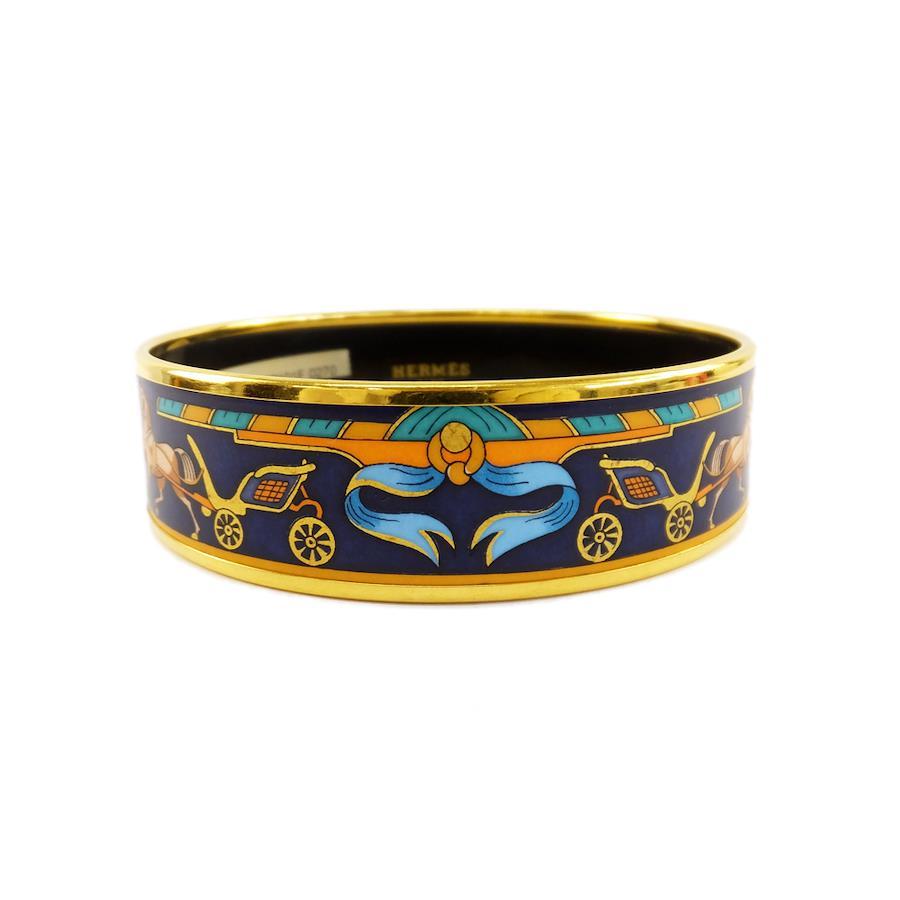 HERMES Hermès enamel MM bangle bracelet in navy blue with gold hardware, featuring a carriage design, weighs approximately 39.1g, fits approximately 21cm wrist, P0041357