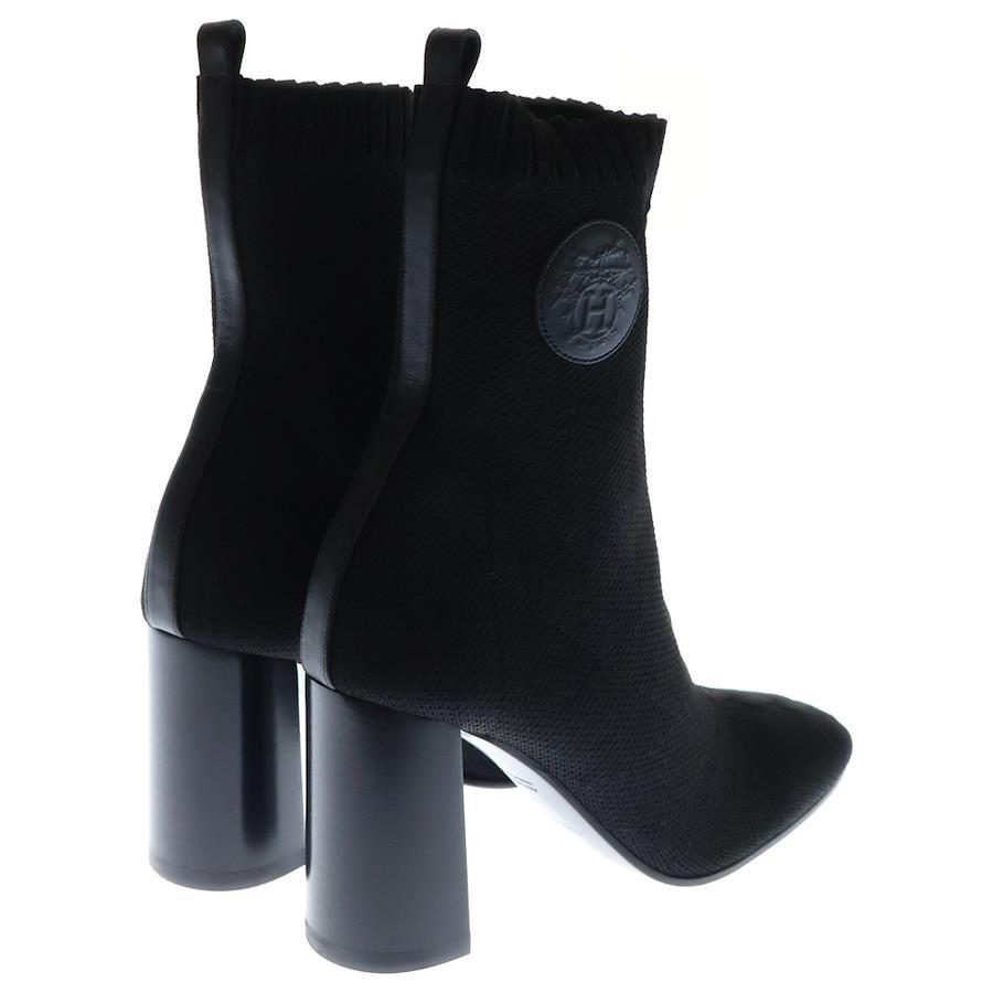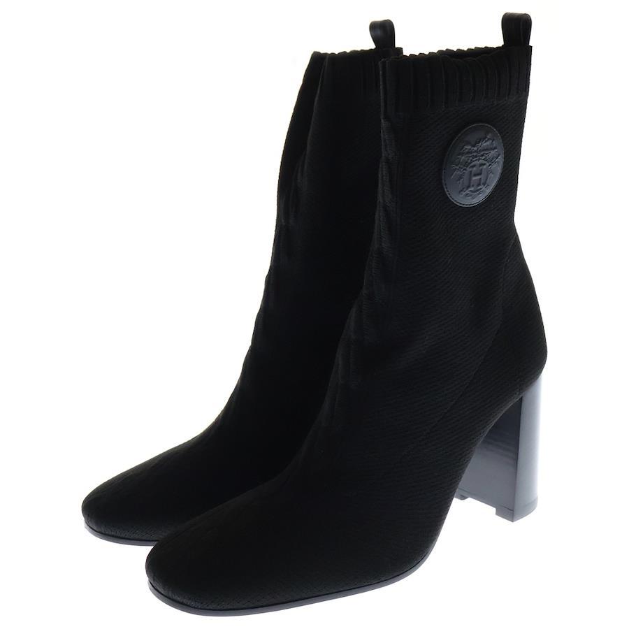[モデル]ジェナ シェニール ニット レザー ヒール ショートブーツ ブラック レディース