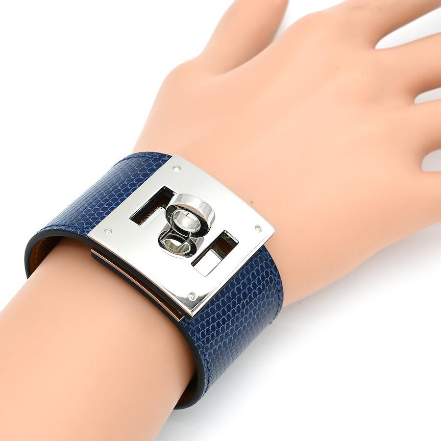 Hermès Kelly Dog Lizard Bangle, Metal, Blue and Silver, Bracelet with Large Metal Buckle, Silver Hardware, "X" Stamp - A Classic, Popular, Excellent ConditionBrand: HermèsStamp: "X" StampModel Number: -FeaturesColor: Blue and SilverMaterial: Lizard / MetalSize: Fits wrists up to 16.5cmMaximum Width: 3.5cmTotal Length: 20cmAdjustable to approximately 14.5, 15.5, and 16.5cmWeight: 34.5gAccessories: Dust bag*No accessories other than those listed are included.Rank: A [Overall Condition Details]There is minor damage due to use and storage, but the item is in relatively good condition. *See images and comments.[Condition Details] Pre-owned, Excellent ConditionThere is light dirt on the leather, and the hardware has scuffs, small scratches, and dents.