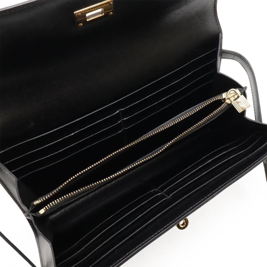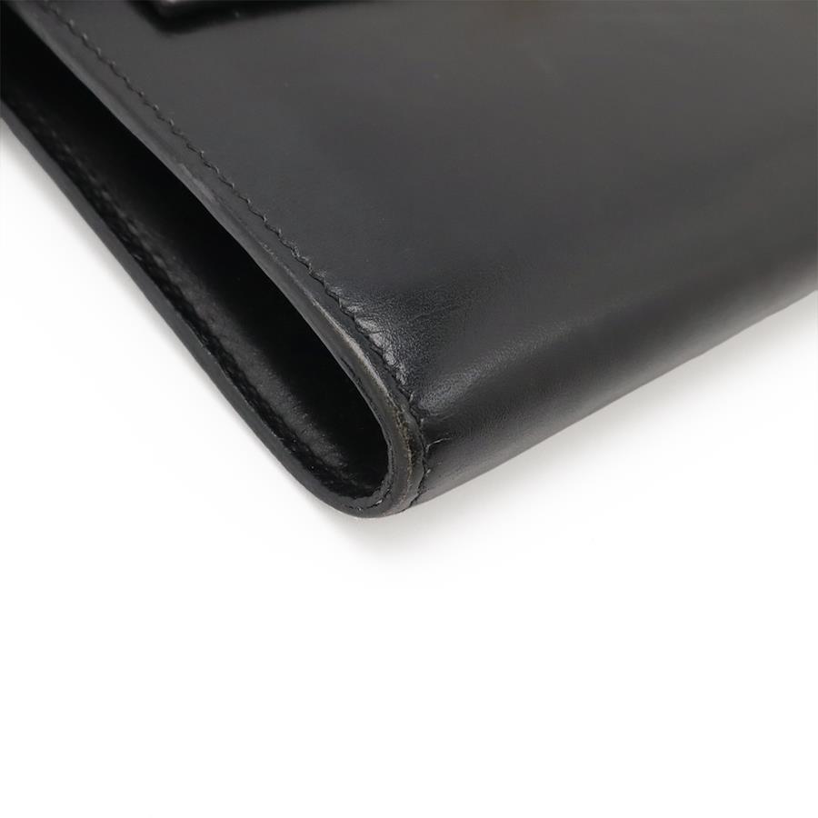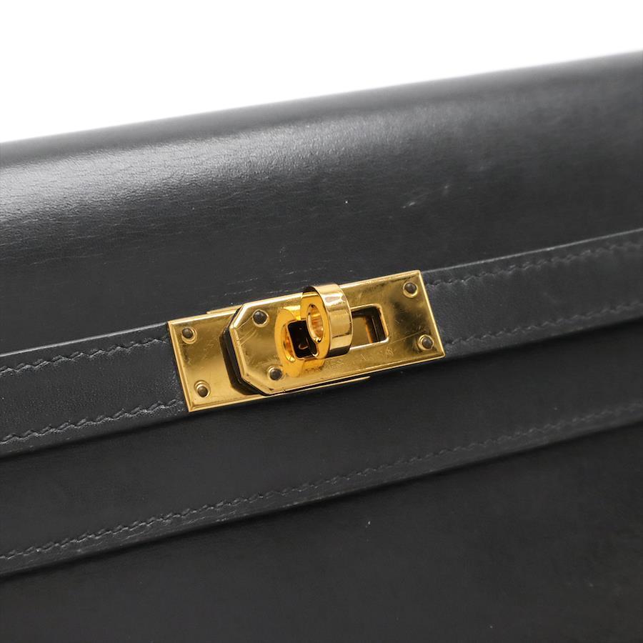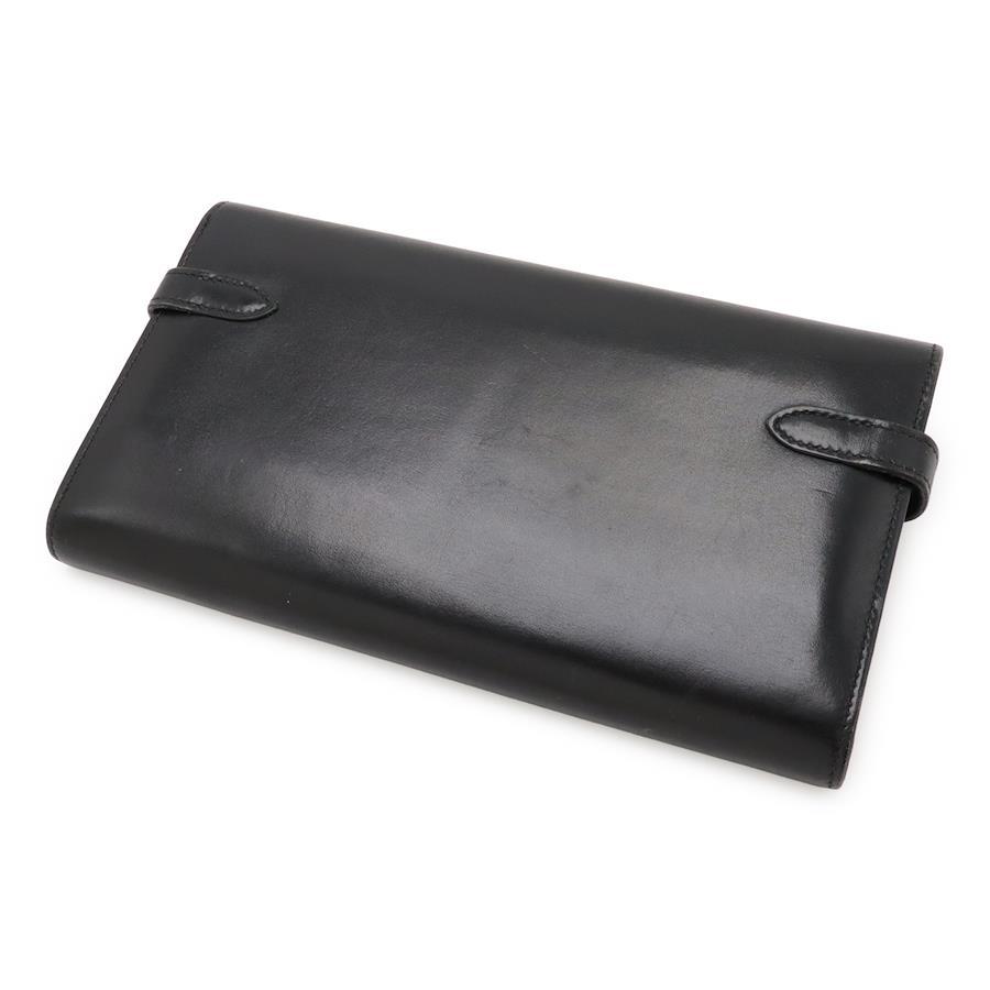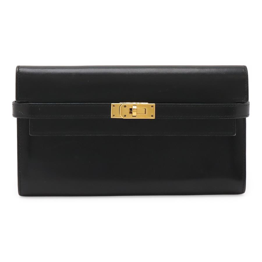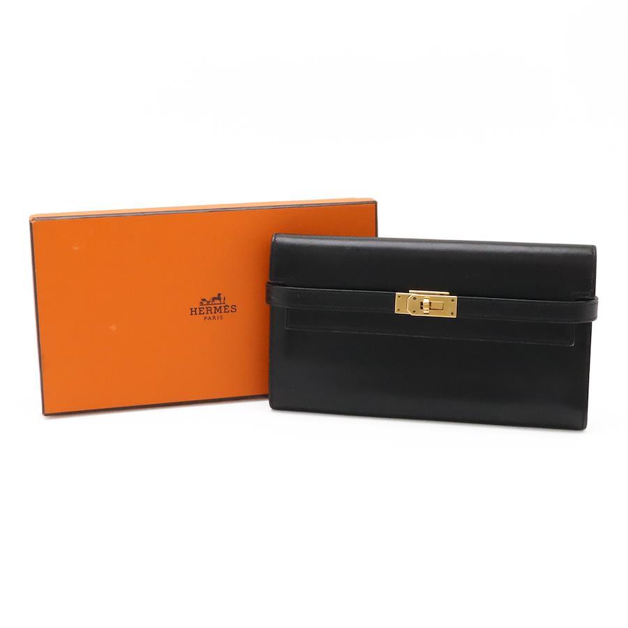 HERMES Kelly Wallet, long, bi-fold wallet, made from black box calf leather with gold hardware and an L stamp.
