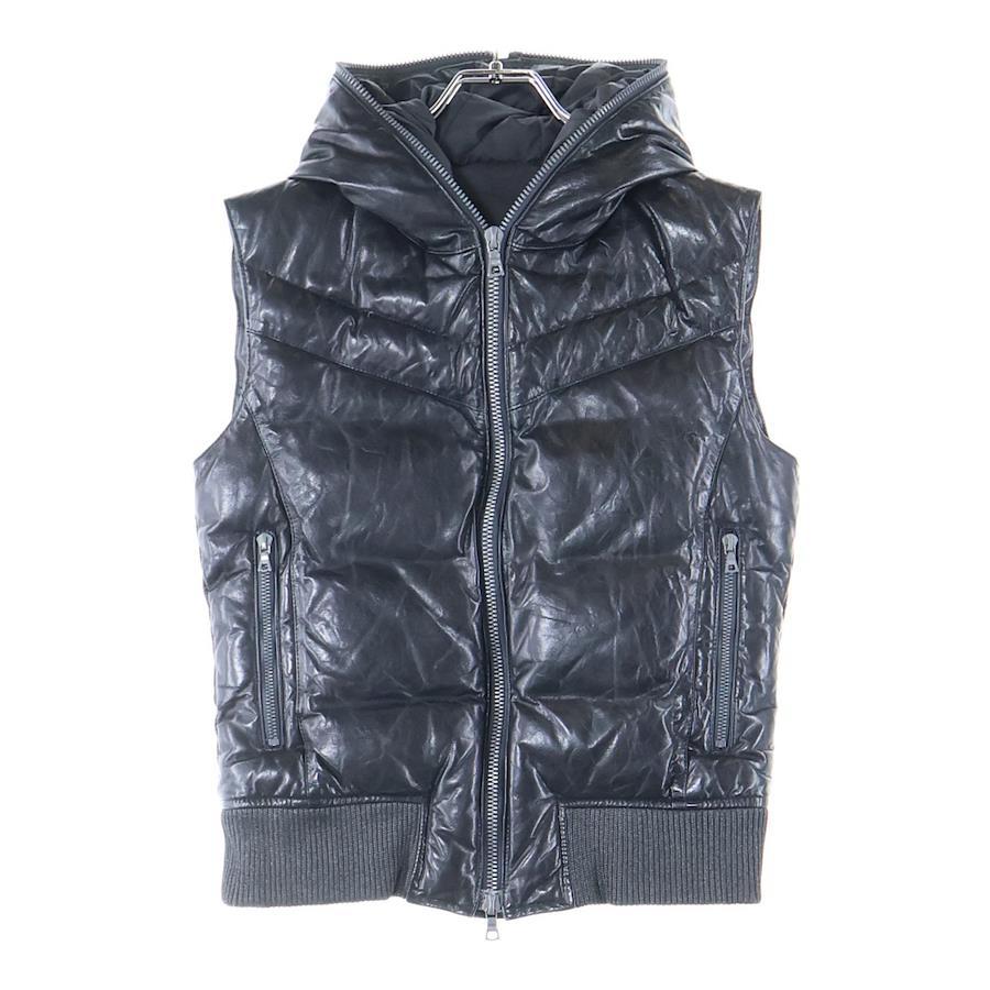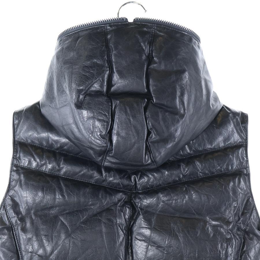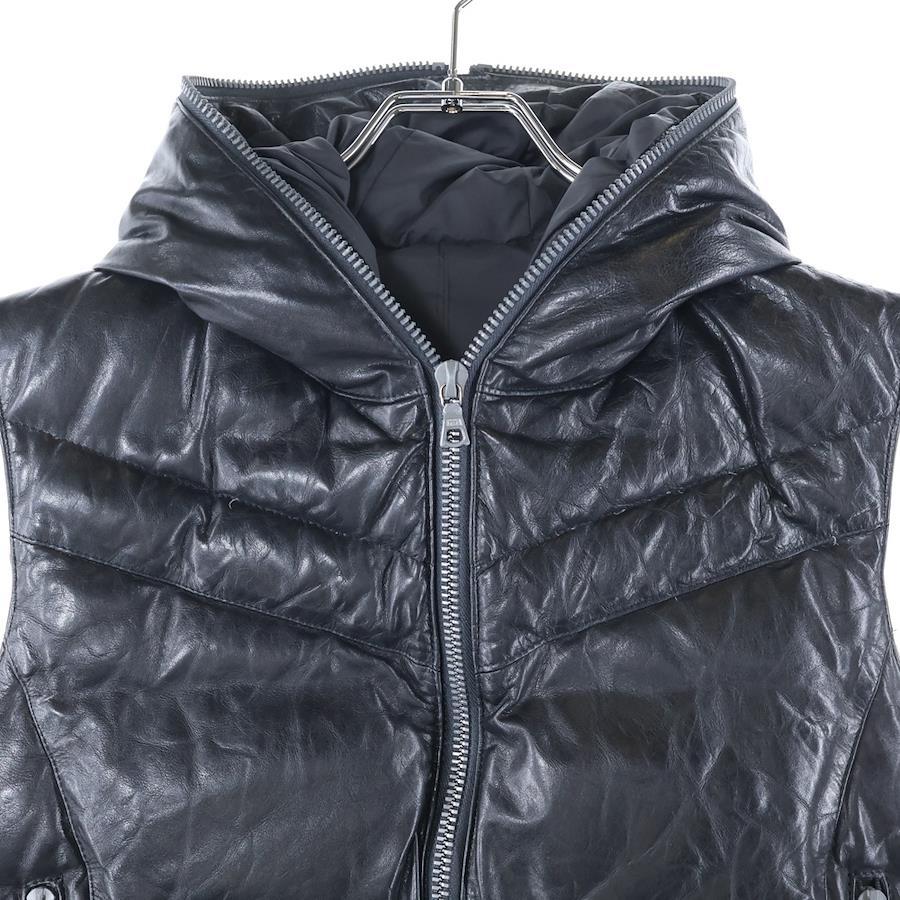 [モデル]カウレザー 牛革 ジップアップ フードダウンジャケット ブラック