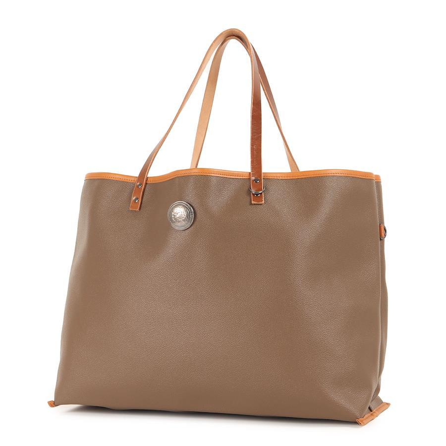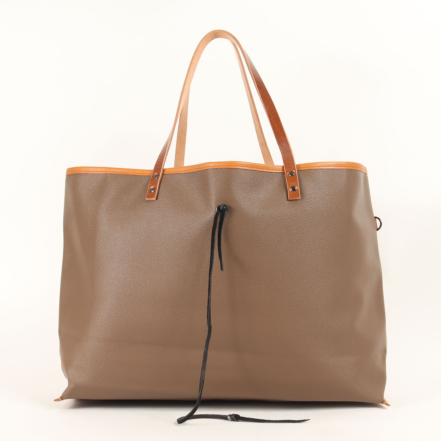| 商品説明 | 軽量で耐水性に優れたPVCレザーを使用し、ハンドルを肉厚のカウレザーであしらったコンチョ付きトートバッグになります。 |