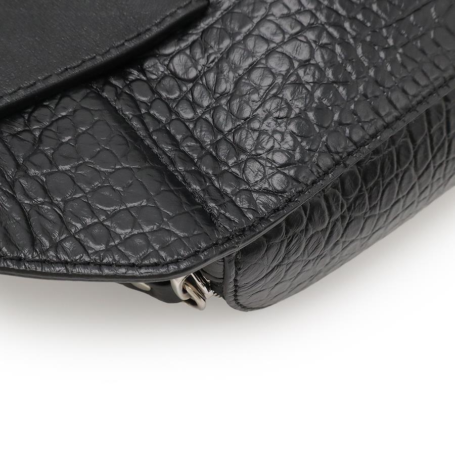 【商品説明】[サイズ]W26cm H14cm ショルダー最長約120cm(調節可、金具含む)[材質]クロコ型押しレザー[カラー]ブラック/シルバー金具[仕様]外側背面ポケット1[付属品]保存袋[重さ]約420g