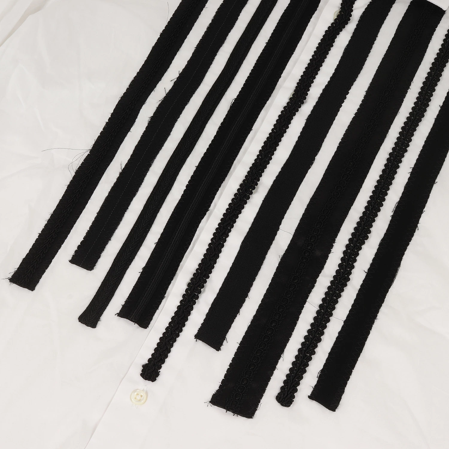 | 商品説明 | フロントにコード刺繍やテープをストライプ調にあしらわれ、エレガントなデザインが配されたコットンブロード生地を使用し、ワイドカラー仕様、ロング丈に仕上げられたドレスシャツです。 |