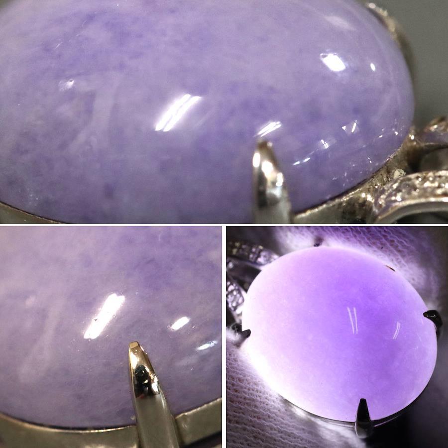 K18WG/Pt900ラベンダー翡翠ダイヤモンドペンダントの中古品です。23.65カラットと大粒で、淡いラベンダー色が上品です。ラベンダー翡翠の表面には小傷があります。中石はわずかにカタカタと動きますが、構造上外れません。地金には小傷があります。