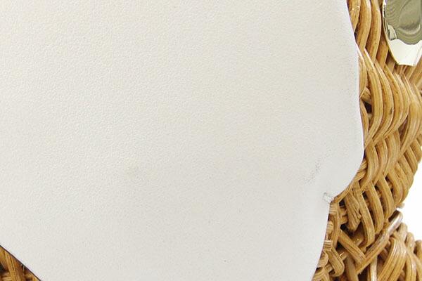 状態:外側:ラタン部分スレ、薄汚れあり。レザーにも所々薄スレ汚れあり。内側:所々ボンド汚れあり。金具:小キズ、スレあり。