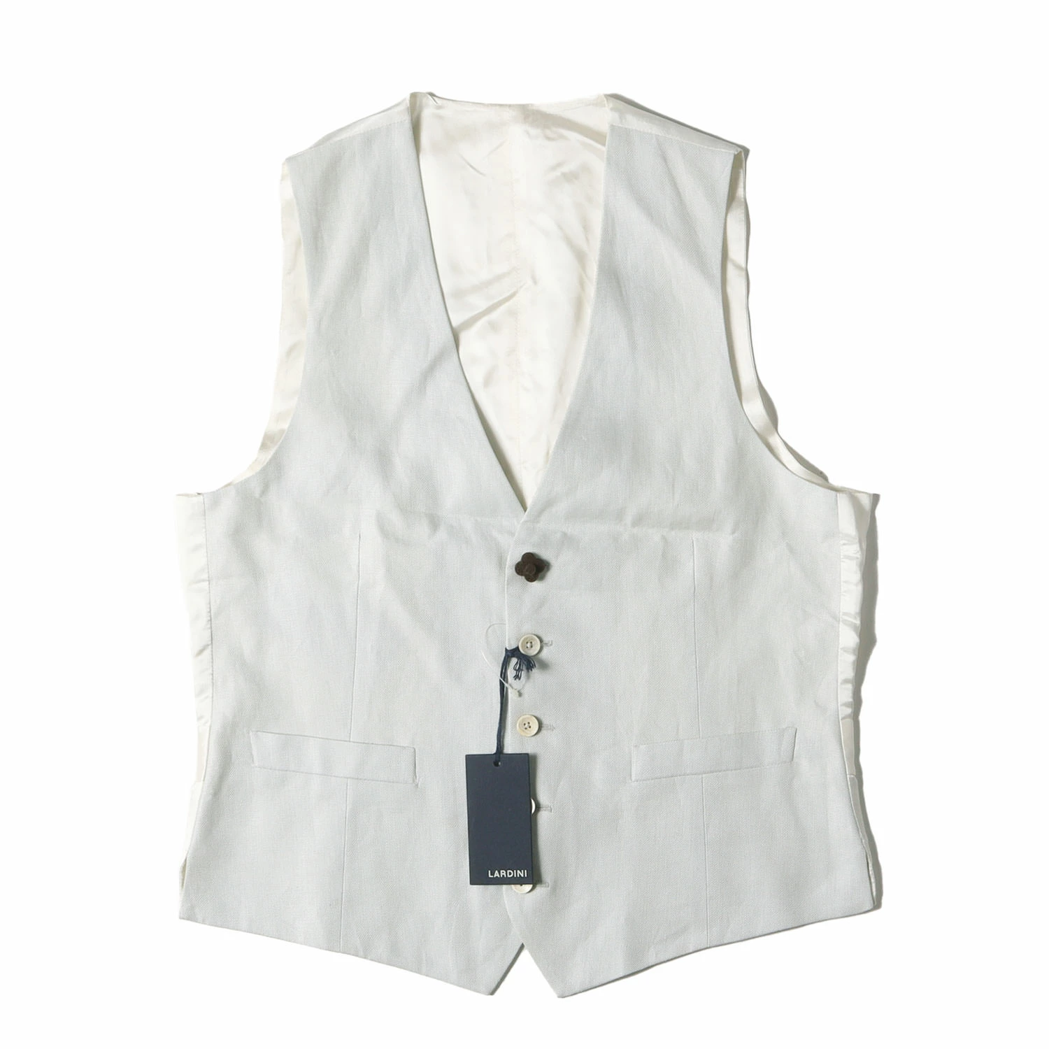 | 商品説明 | しっかりとした上質なリネン素材をメインに、バックは上品な光沢感のあるレーヨンキュプラ混紡生地を使用し、ブートニエール付きの5つボタン仕様で仕上げられたジレベストです。 |