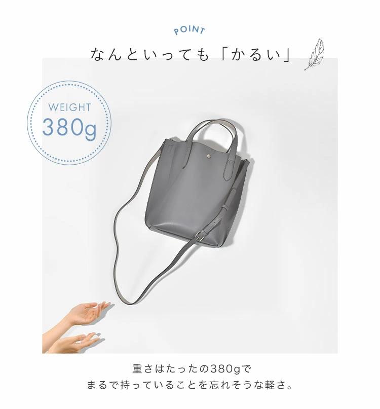 【縦型2WAYトートバッグ】「 オンオフで使える軽いカバン 」をコンセプトに開発した合成皮革を使用したアイテム。ほどよいハリとやわらかさがあり、本革のようなしっとりとした手触りです。縦に長財布やペットボトルが入るサイズ感で重さはたったの380g。まるで持っているのを忘れそうな軽さです。コンパクトだけど収納力は抜群◎ショルダー紐は取り外してトートとして使うこともできる便利な2way仕様です。カジュアルにも綺麗めにも合うシンプルなデザイン。やさしいカラーリングでコーディネートの邪魔をしません。普段使いやちょっとしたお出かけにぴったり◎