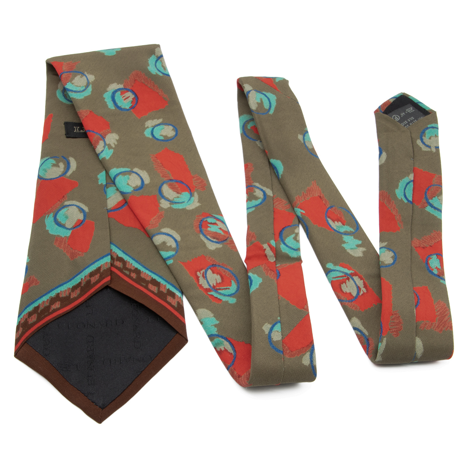 こちらのネクタイは、落ち着いたグレーグリーンを基調に、レッドやブルー、水色といった鮮やかな色彩の円形モチーフが散りばめられた総柄デザインで、モダンで洗練された印象を与えます。