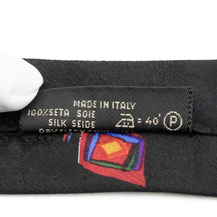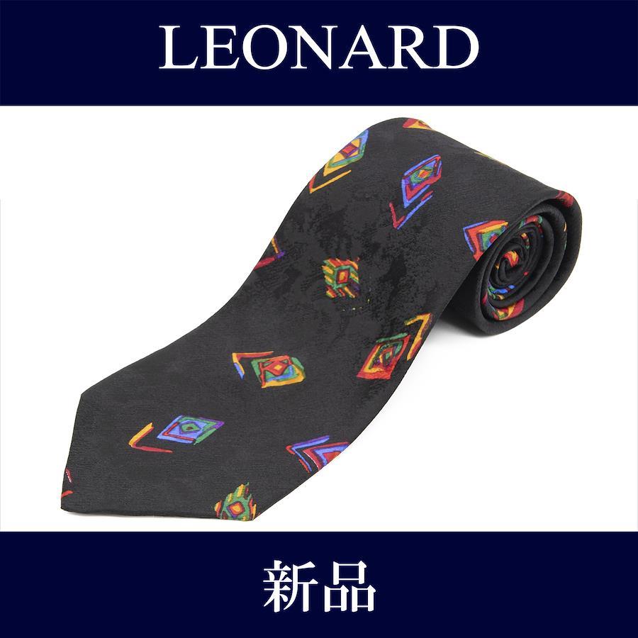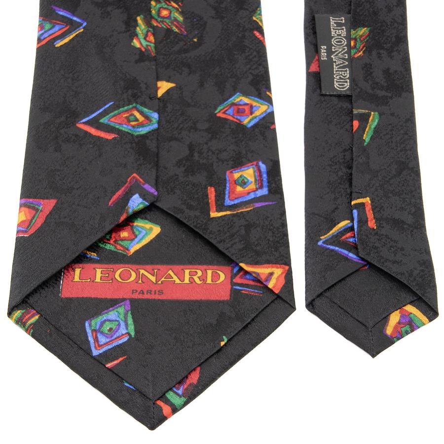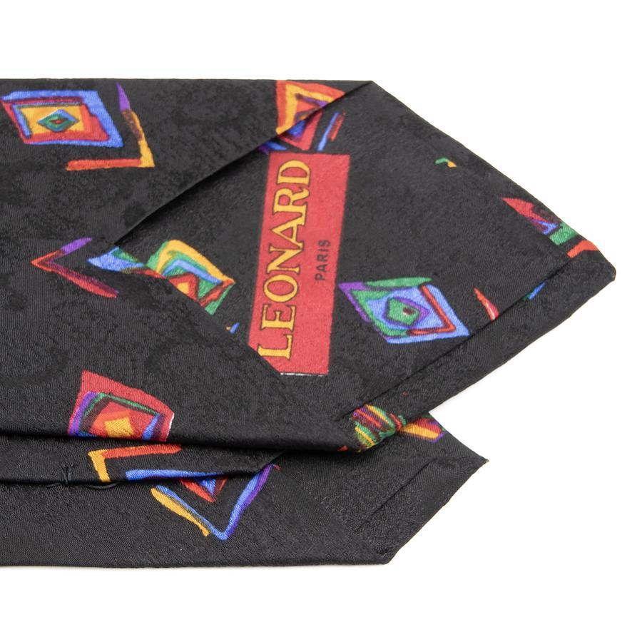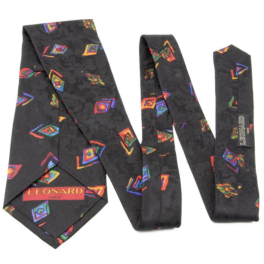 胸元に差をつける、レオナールのレギュラータイでございます。黒を基調としながらも、様々な色彩の幾何学模様が大胆に配置されており、見る人の目を惹きつけます。