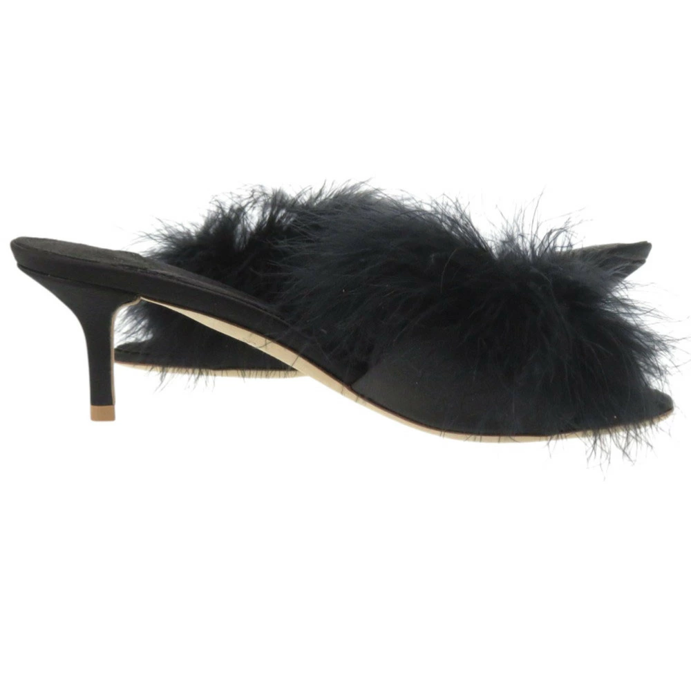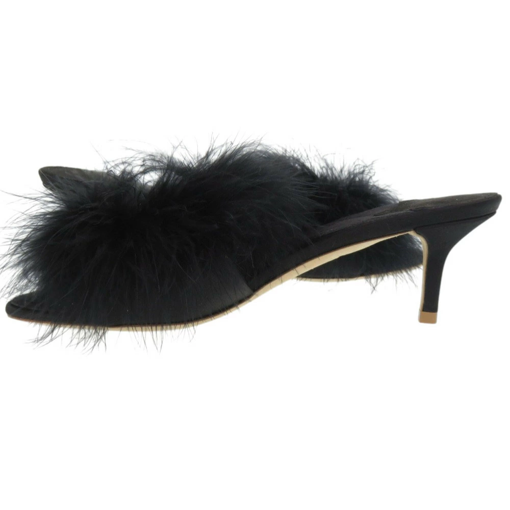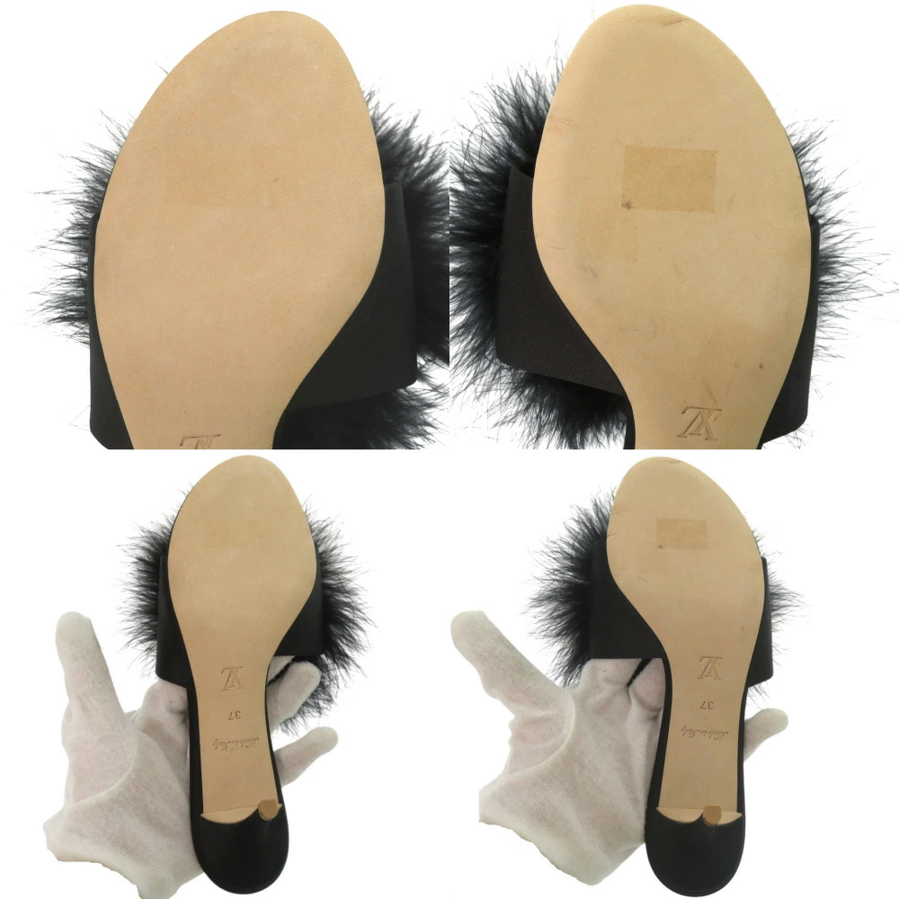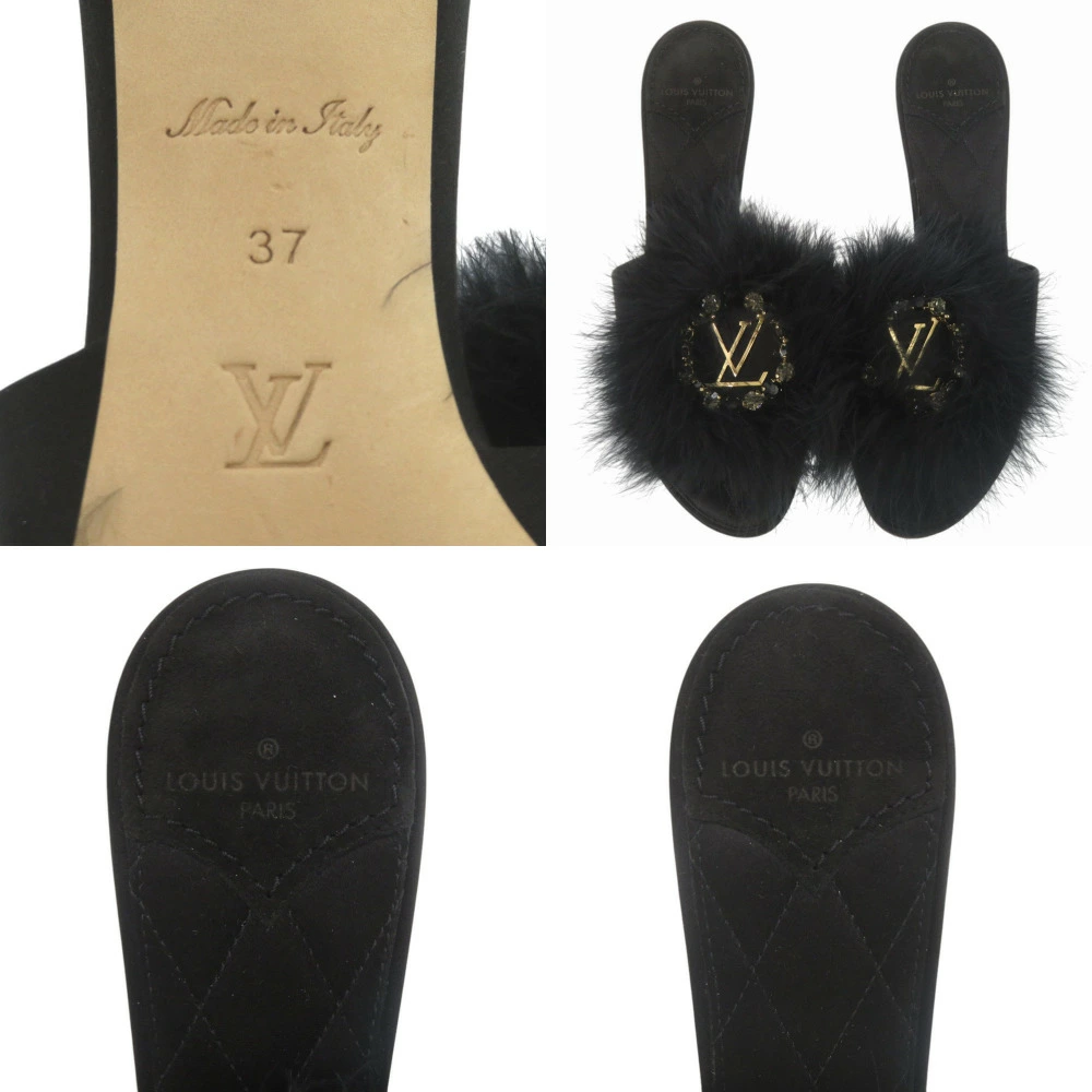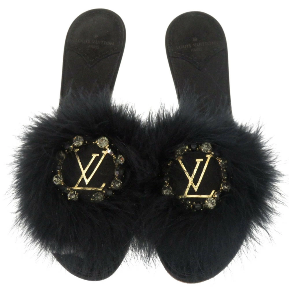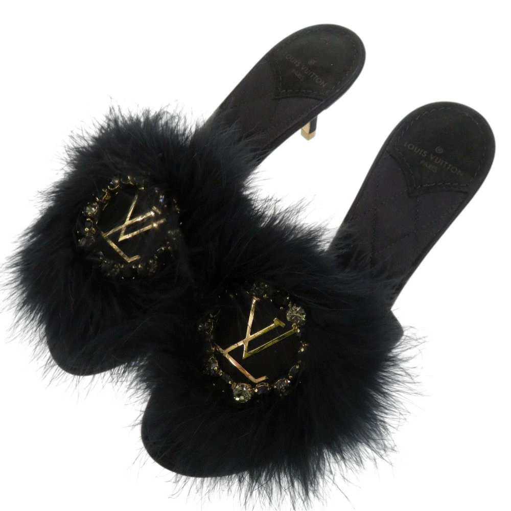 Like new Louis Vuitton fur, crystal, LV logo, Marilyn kitten heel, MA0168, size 37 (Japan size 24cm), gold hardware, satin, black mules, LV 1299 [Pre-owned] LOUIS VUITTON