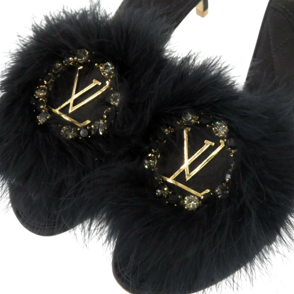 新品同様 ルイ ヴィトン ファー クリスタル LVロゴ マリリン キトンヒール MA0168 サイズ37 (日本サイズ24cm) ゴールド金具 サテン ブラック ミュール LV 1299【中古】LOUIS VUITTON