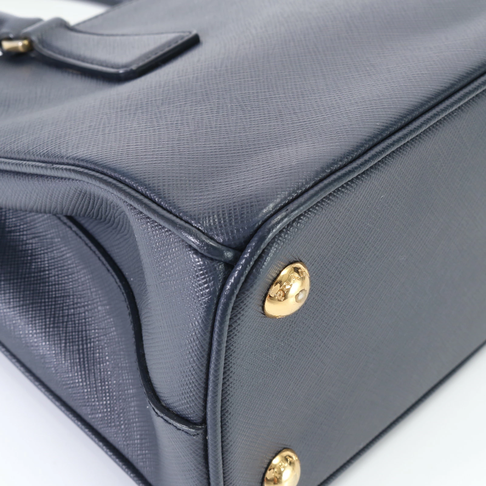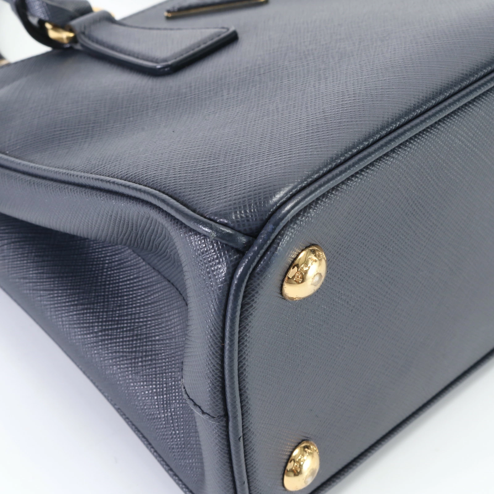Like new Prada Saffiano Galleria triangle logo leather handbag tote with top handles in navy blue, EEM O8-7, for women.