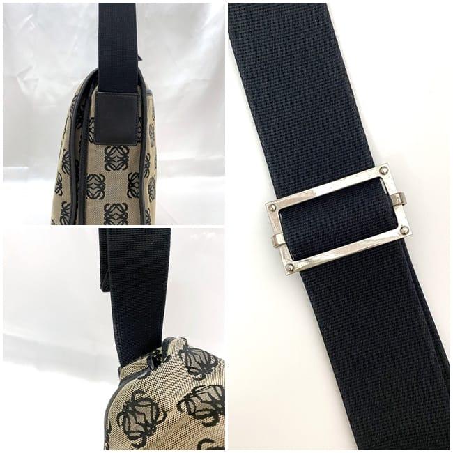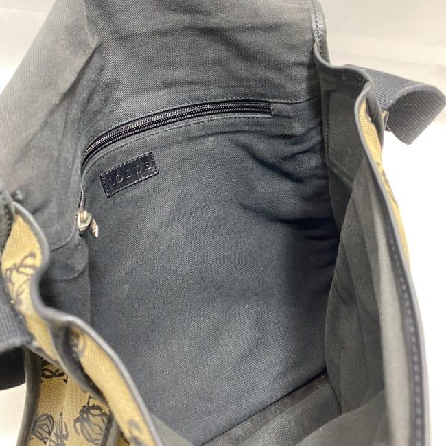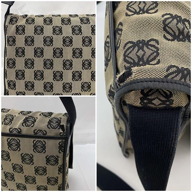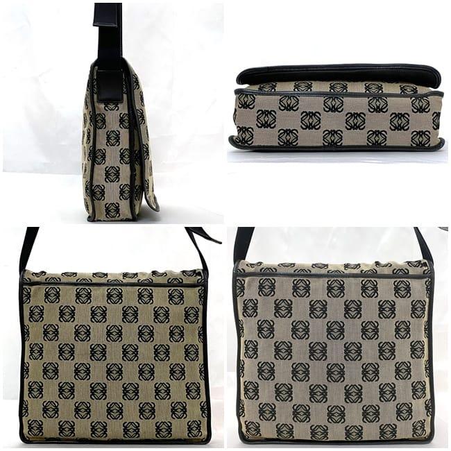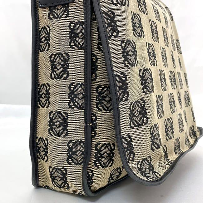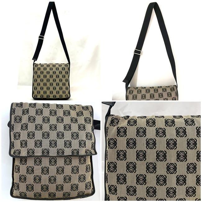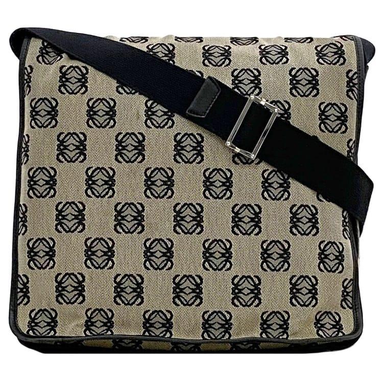 ロエベ メッセンジャー バッグ ec-23351 ベージュ ブラック アナグラム ショルダーバッグ キャンバス レザー 中古 150306 LOEWE ヴィンテージ フラップ クロスボディ 定番 人気 女性 レディース 鞄 お洒落 総柄 ロゴ 黒色 高級感 上品 ブランド 本物 鑑定済み