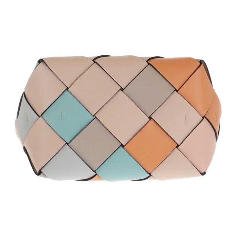 マルチカラーのサープラス(余剰)レザーを手作業で市松模様に編み込んだ2wayバッグ。