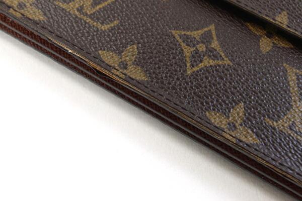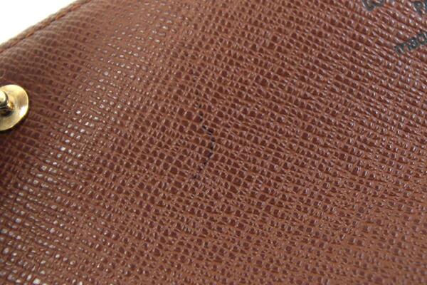 状態:外側:型崩れ・モノブラム柄に光沢・フチに反りあり。フチ(コバ)にスリ減り・剥がれあり。内側:スレ、薄汚れ、フラップ裏ペン跡あり。ポケットのフチに毛羽立ちあり。小銭入れ内剥がれ、黒ずみヨゴレあり。金具:小キズ、スレ、クスミ変色あり。