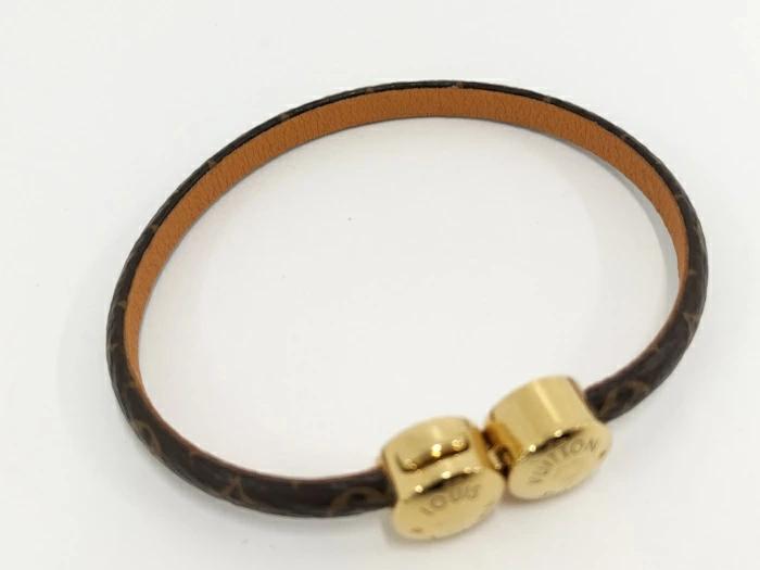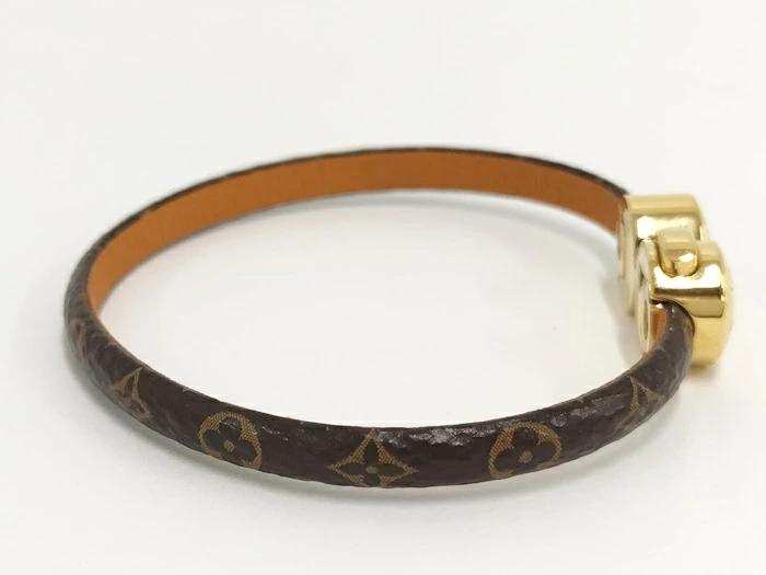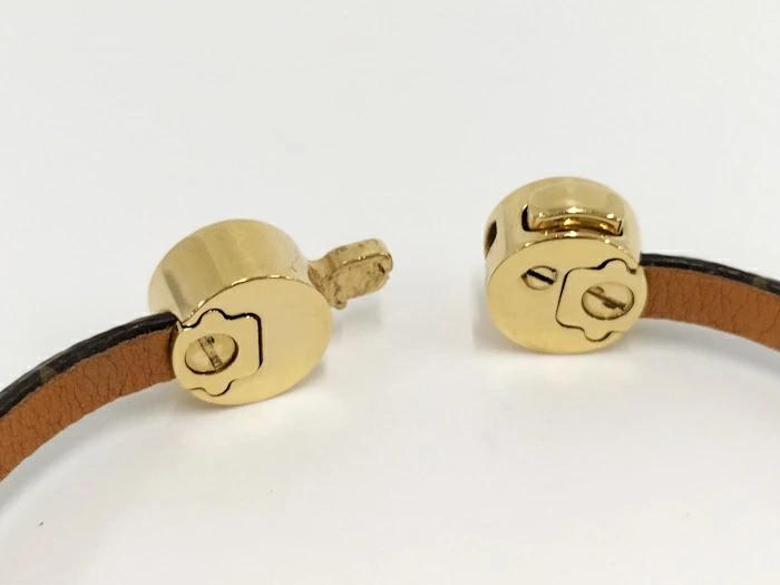 [商品情報]・カラー:ブラウン/ゴールド・素材/ライン:レザー/メッキ・サイズ:最大約 全長17(cm) 腕回り15(cm)・トップ:最大約W2.0×H1.0(cm) 幅約0.4(cm)