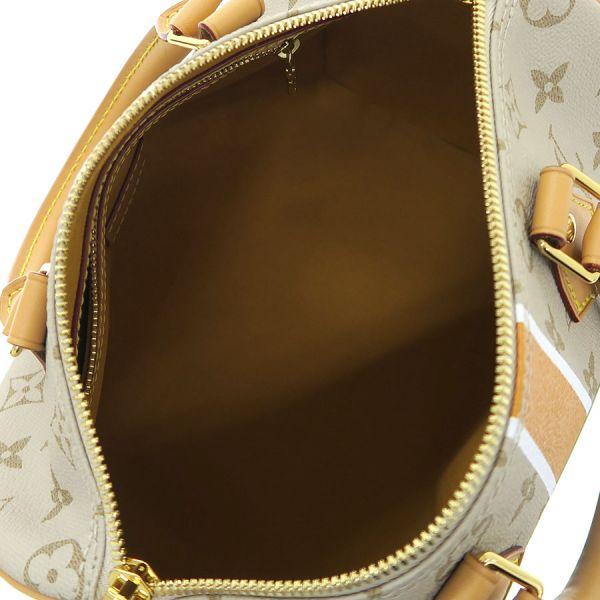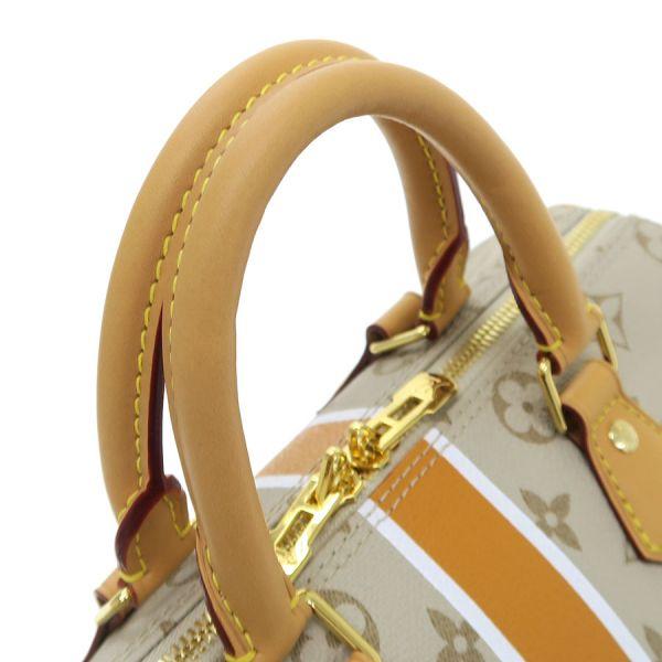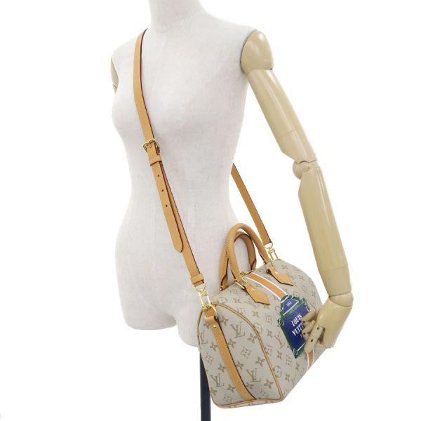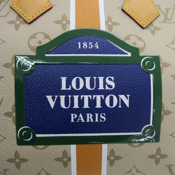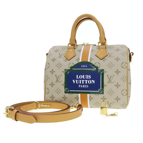 ベージュのモノパナム・キャンバスをメゾンならではのシェイプに仕立て、メゾン初期のトランクに見られるホワイト & オーチャーカラー & ホワイトの縦方向のストライプをあしらった「スピーディ・バンドリエール 25」のご紹介です。 中央にはパリのストリートサインを模したモチーフが光ります。 グリーンのフレームで縁取ったブルーの背景には、大胆なホワイトの「Louis Vuitton Paris」シグネチャーを添えて、メゾンならではの雰囲気をプラス。状態はSランクのお品で、保管時におけるヌメ革部の色焼けが見受けられる程度で、使用感の抑えられた美品のコンディションです。 新作のコレクションとなり、まだまだ出回りの少ない逸品で、おすすめですよ。 いかがでしょうか?