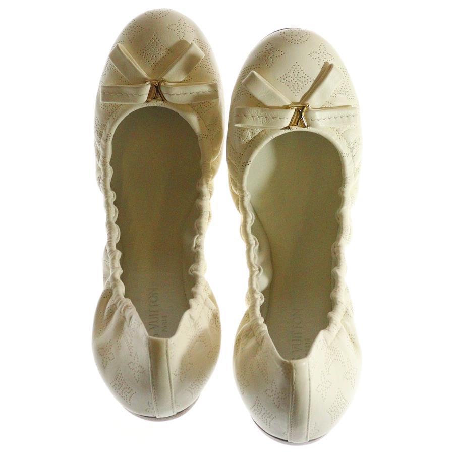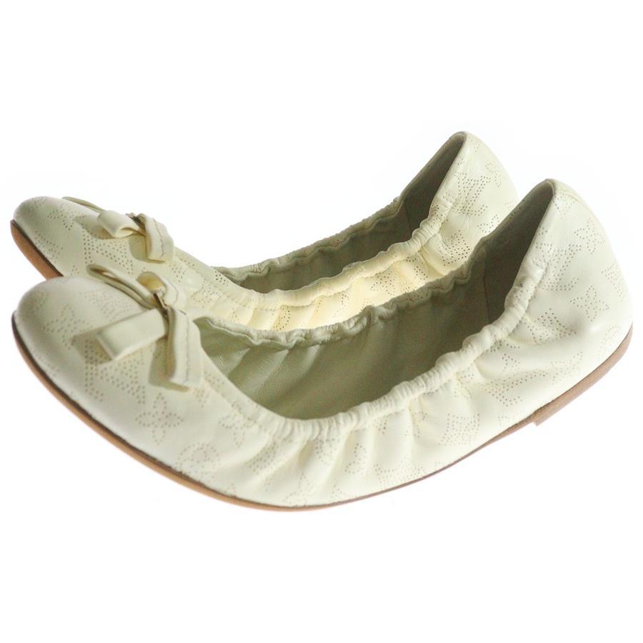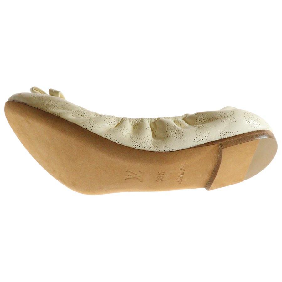 [モデル]モノグラム マヒナ ロゴプレート レザー リボン パンチングレザー フラット バレエシューズ ホワイト レディース