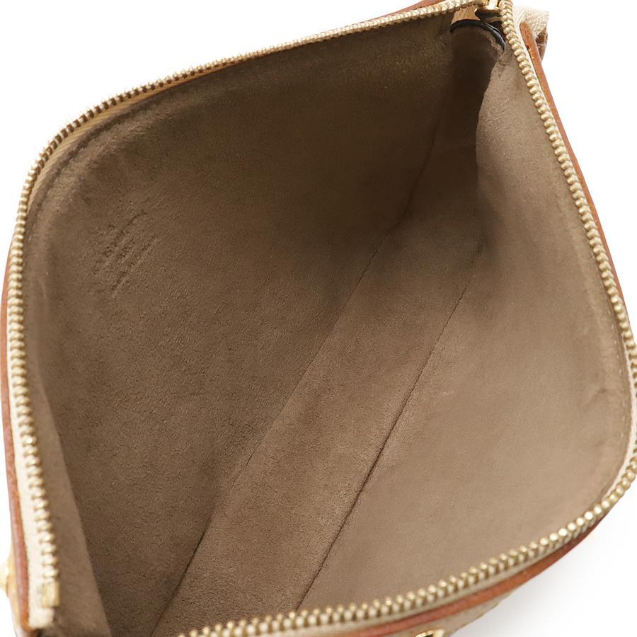 【コンディション】[外側]ヌメ革黒ずみ、若干のスレ、角スレ、ファスナーテープ一部ノリ染み、表面しっとり感[内側]わずかな色汚れ、毛羽立ち[ストラップ]黒ずみ、シミ[金具]スレ、若干のメッキ剥げ[特記事項]製造番号 SL0033