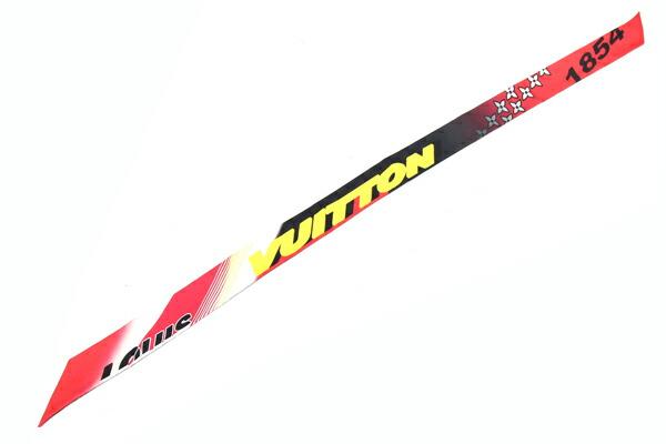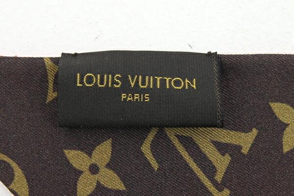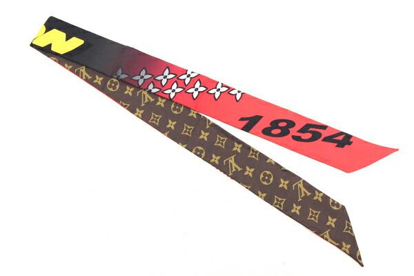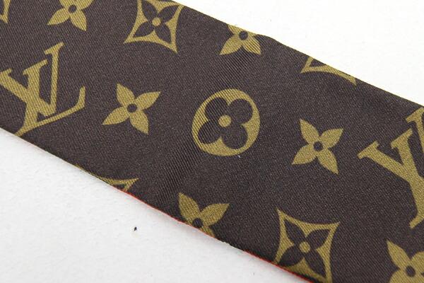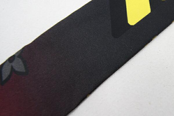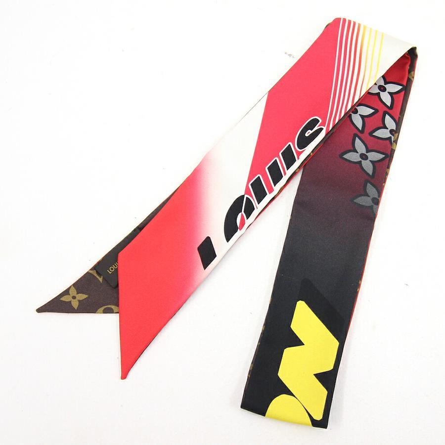 ルイヴィトンスカーフバンドーBBMP2014レッドイエローブラウンシルク100%中古リボンスカーフバッグチャームレディースレースラインLOUISVUITTON