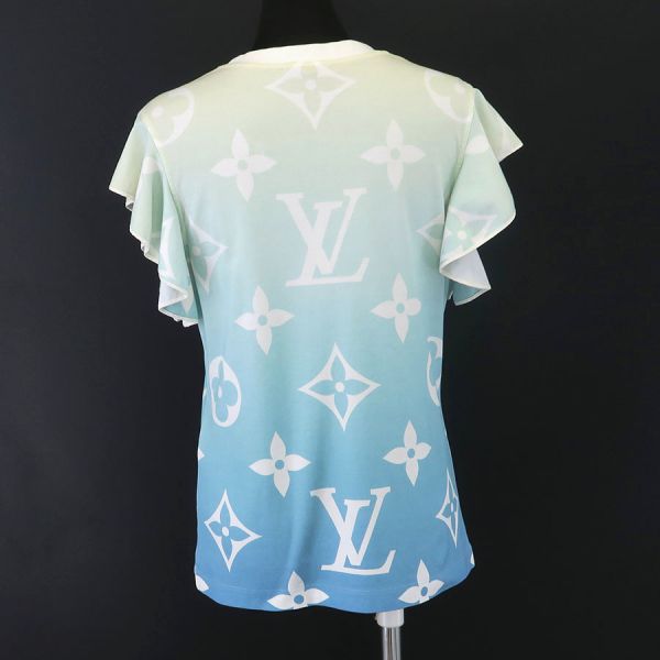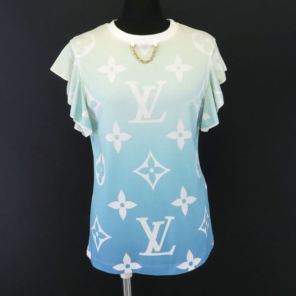 ■採寸#M 肩幅:38cm 袖丈:約8cm B:86cm 着丈:57cm■素材コットン100%■コメントルイ・ヴィトンからTシャツが入荷しました。ペールグリーンからブルーまでの夏らしいグラデーションのTシャツにLVロゴとモノグラムフラワーがデザインされた爽やかな一品です。袖が大きめのフリルとなっているので涼し気で可愛らしいシルエットになっております。全体にコットン特有の起毛・ヨレ・シワ、後ろ右肩甲骨辺りに茶色い点汚れ、アームホール部分のゴムの黄ばみ、襟のくすみ汚れ、後ろのモノグラムフラワーの色褪せ、チェーン部分の小キズ・スレが見受けられる為Bランクでのご紹介です。着用時に目立つような大きなダメージは見られませんでした。